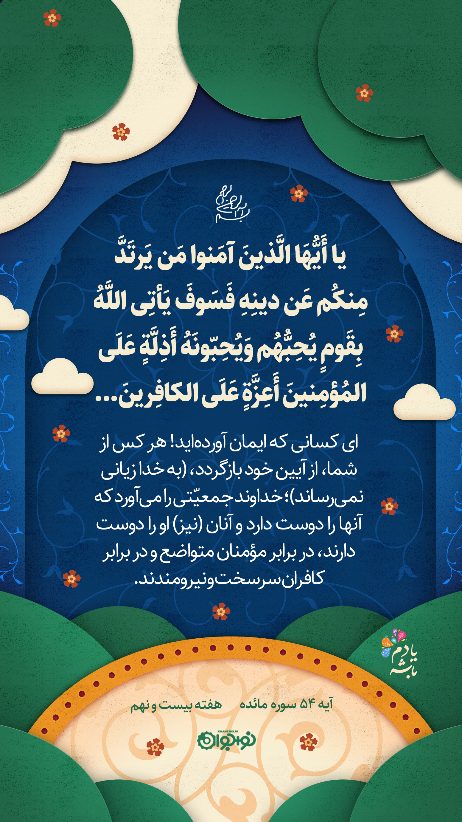 اى كسانى كه ايمان آوردهاید! هر كس از شما، از آیین خود بازگردد (به خدا زیانی نمیرساند) خداوند جمعیتی را میآورد كه آنها را دوست دارد و آنان [نيز] او را دوست دارند، در برابر مؤمنان متواضع و در برابر كافران سرسخت و نیرومندند.