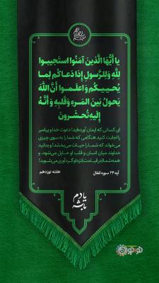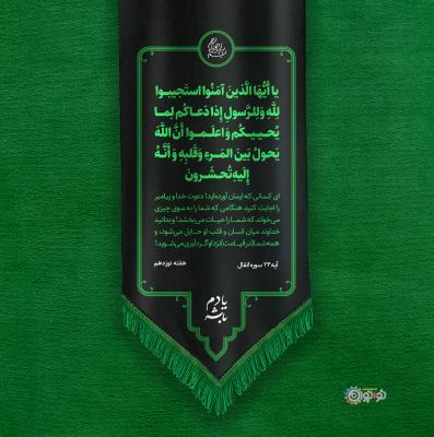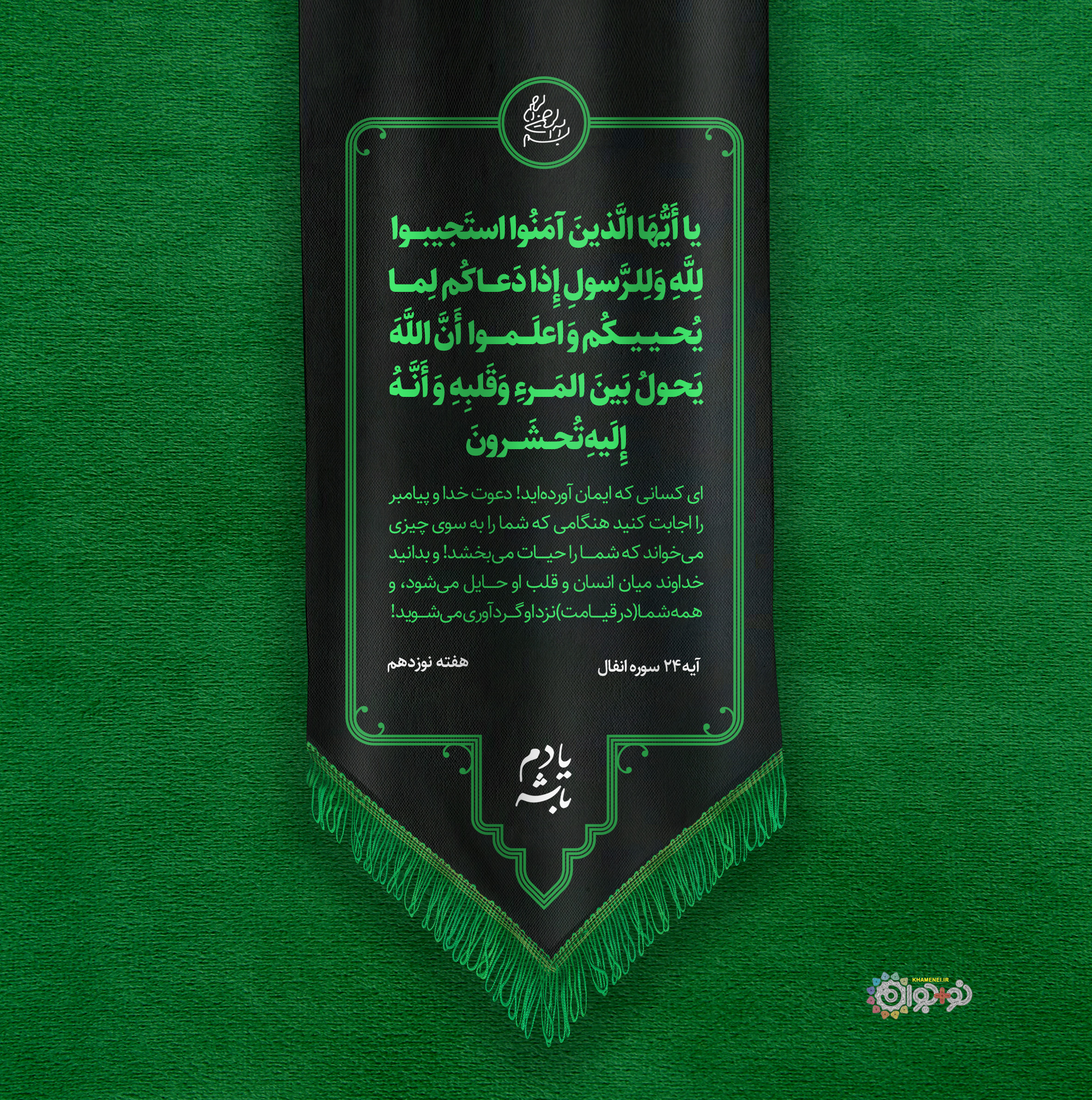 ای کسانی که ایمان آوردهاید! دعوت خدا و پیامبر را اجابت کنید هنگامی که شما را به سوی چیزی میخواند که شما را حیات میبخشد! و بدانید خداوند میان انسان و قلب او حایل میشود، و همه شما (در قیامت) نزد او گردآوری میشوید!
