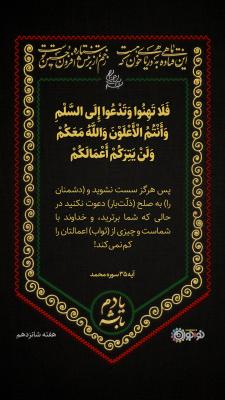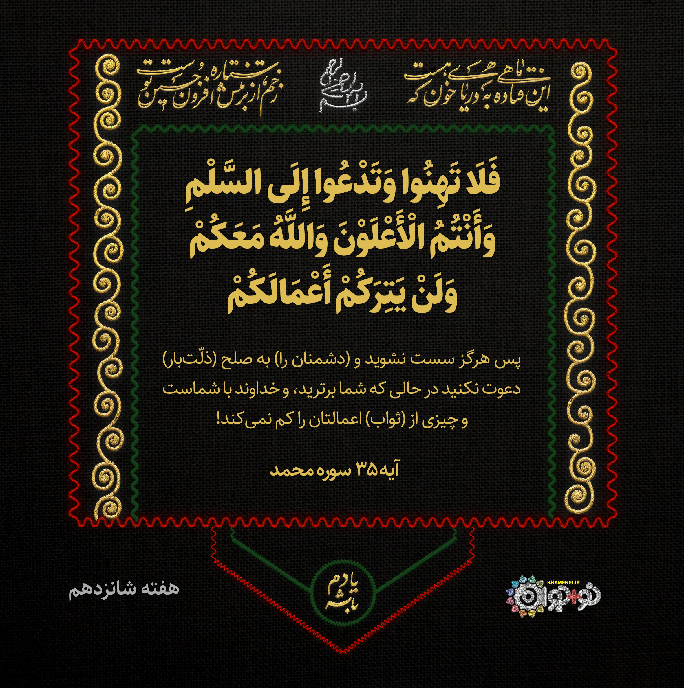 پس هرگز سست نشوید و (دشمنان را) به صلح (ذلّتبار) دعوت نکنید در حالی که شما برترید، و خداوند با شماست و چیزی از (ثواب) اعمالتان را کم نمیکند!