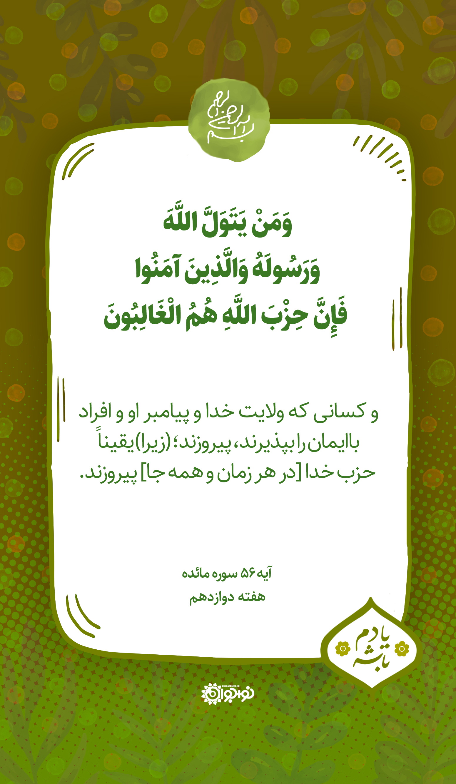و کسانی که ولایت خدا و پیامبر او و افراد باایمان را بپذیرند، پیروزند؛ (زیرا) یقیناً حزب خدا [در هر زمان و همهجا] پیروزند.