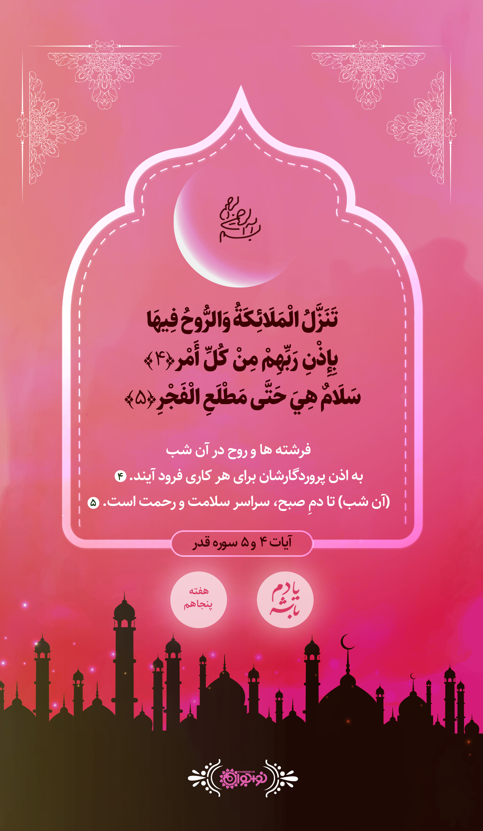 فرشتهها و روح در آن شب به اذن پروردگارشان برای هر کاری فرود میآیند(4) (آن شب) تا دمِ صبح، سراسر سلامت و رحمت است (5)