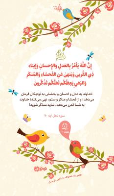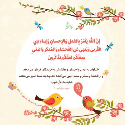 خداوند به عدل و احسان و بخشش به نزدیکان فرمان میدهد؛ و از فحشا و منکر و ستم، نهی میکند؛ خداوند به شما اندرز میدهد، شاید متذکّر شوید!