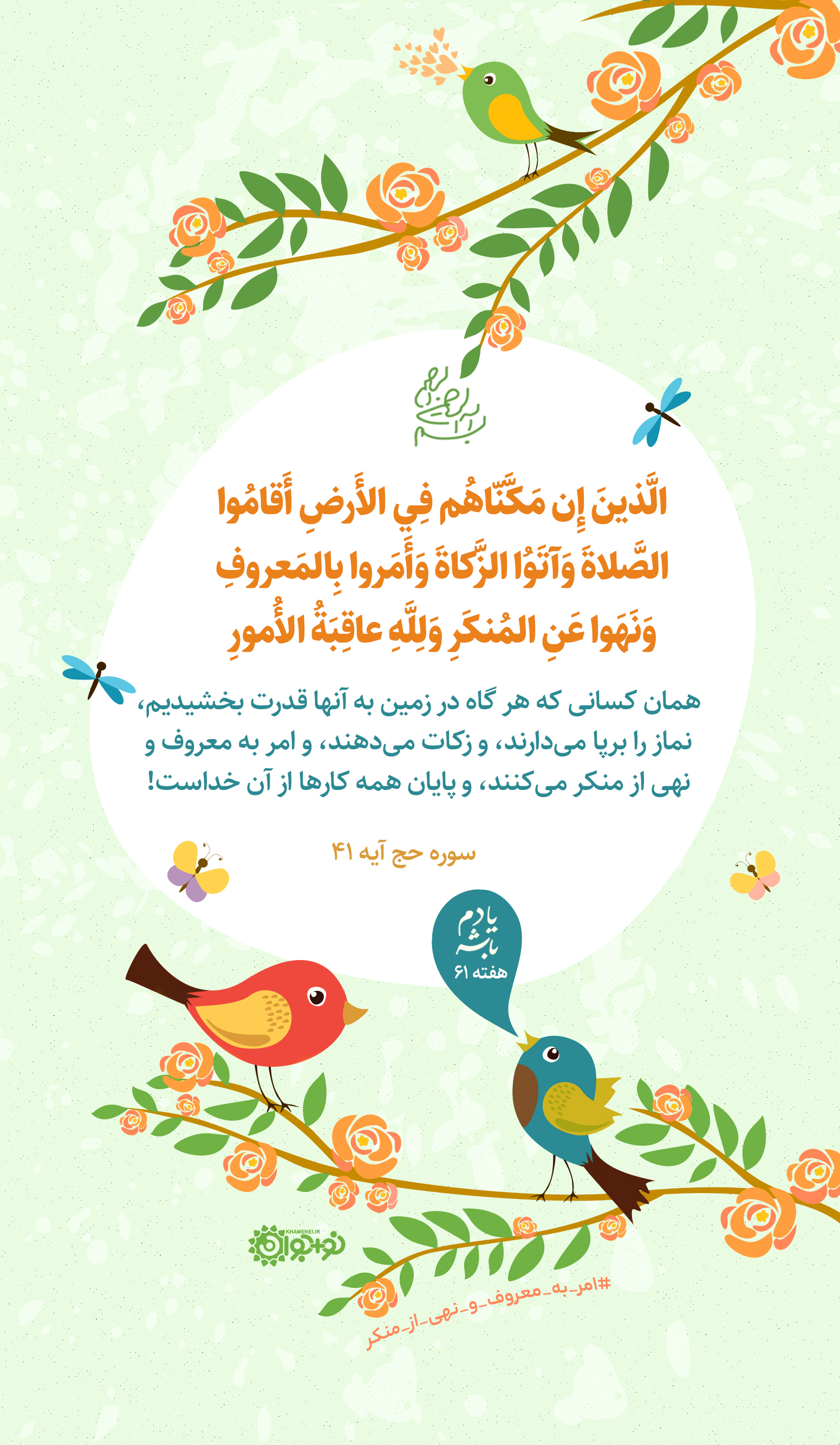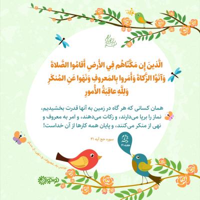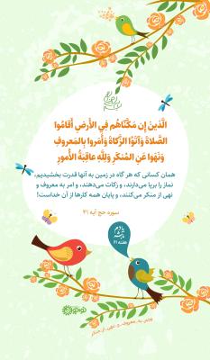 همان کسانی که هر گاه در زمین به آنها قدرت بخشیدیم، نماز را برپا میدارند، و زکات میدهند، و امر به معروف و نهی از منکر میکنند، و پایان همه کارها از آن خداست!
