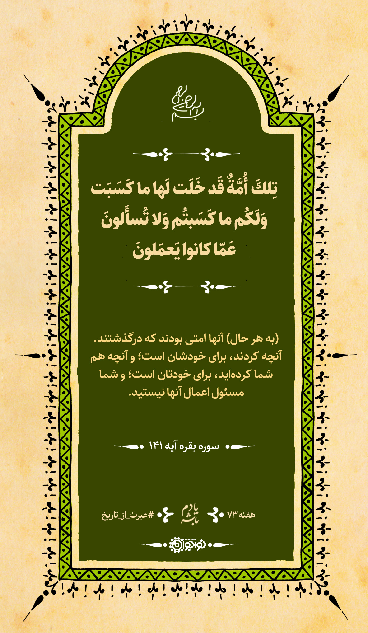 (به هر حال) آنها امتی بودند که درگذشتند. آنچه کردند، برای خودشان است؛ و آنچه هم شما کردهاید، برای خودتان است؛ و شما مسئول اعمال آنها نیستید.