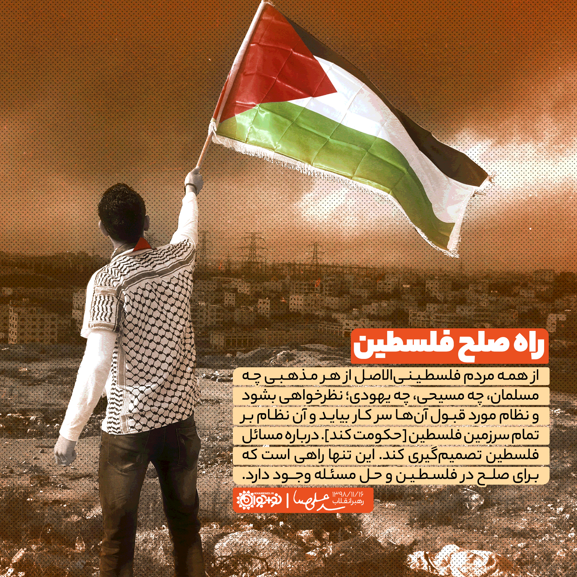 از همه مردم فلسطینیالاصل، از هر مذهبی چه مسلمان، چه مسیحی، چه یهودی؛ نظرخواهی بشود و نظامِ مورد قبول آنها سرِ کار بیاید و آن نظام بر تمام سرزمین فلسطین [حکومت کند]. درباره مسائل فلسطین تصمیمگیری کند. این تنها راهی است که برای صلح در فلسطین و حلّ مسئله وجود دارد.