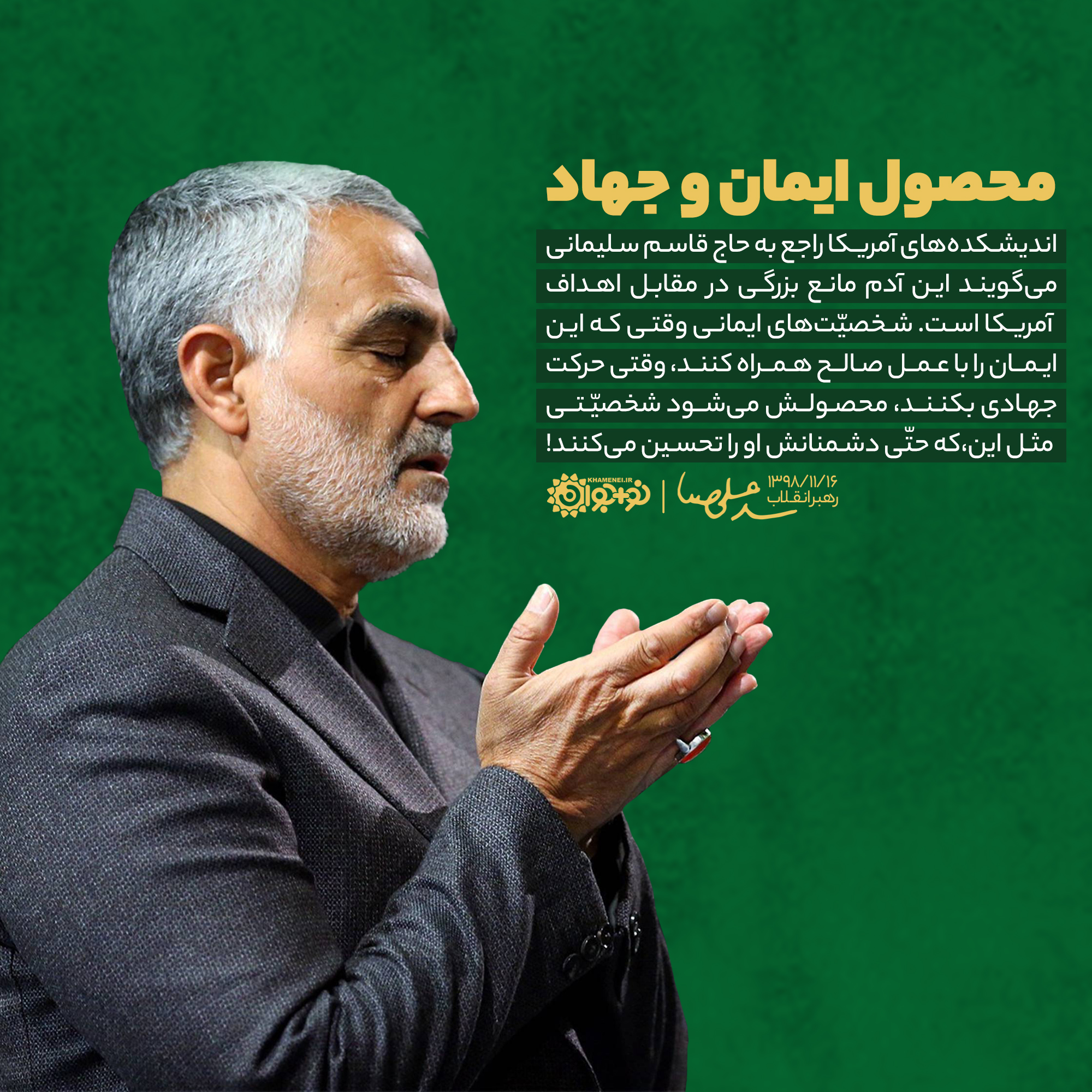 اندیشکدههای آمریکا راجع به حاج قاسم سلیمانی میگویند این آدم مانع بزرگی در مقابل اهداف آمریکا است. شخصیّتهای ایمانی وقتی که این ایمان را با عمل صالح همراه کنند، وقتی حرکت جهادی بکنند، محصولش میشود شخصیّتی مثل این، که حتّی دشمنانش او را تحسین میکنند!