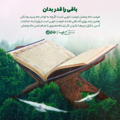 فرصت ماه رمضان فرصت خوبی است؛ اگر چه به اواخر ماه رسیدیم لکن همین چند روزی که باقی مانده، فرصت خوبی است [برای] دعا، مناجات، اُنس با قرآن؛ و رها نكردن كار ارتباط معنوی با تمام شدن ماه رمضان.
