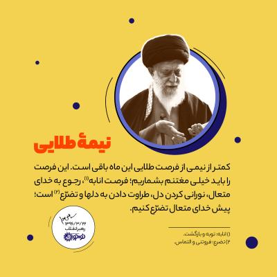 کمتر از نیمی از فرصت طلایی این ماه باقی است. این فرصت را باید خیلی مغتنم بشماریم؛ فرصت انابه(۱)، رجوع به خدای متعال، نورانی کردن دل، طراوت دادن به دلها و تضرّع(۲) است؛ پیش خدای متعال تضرّع کنیم.