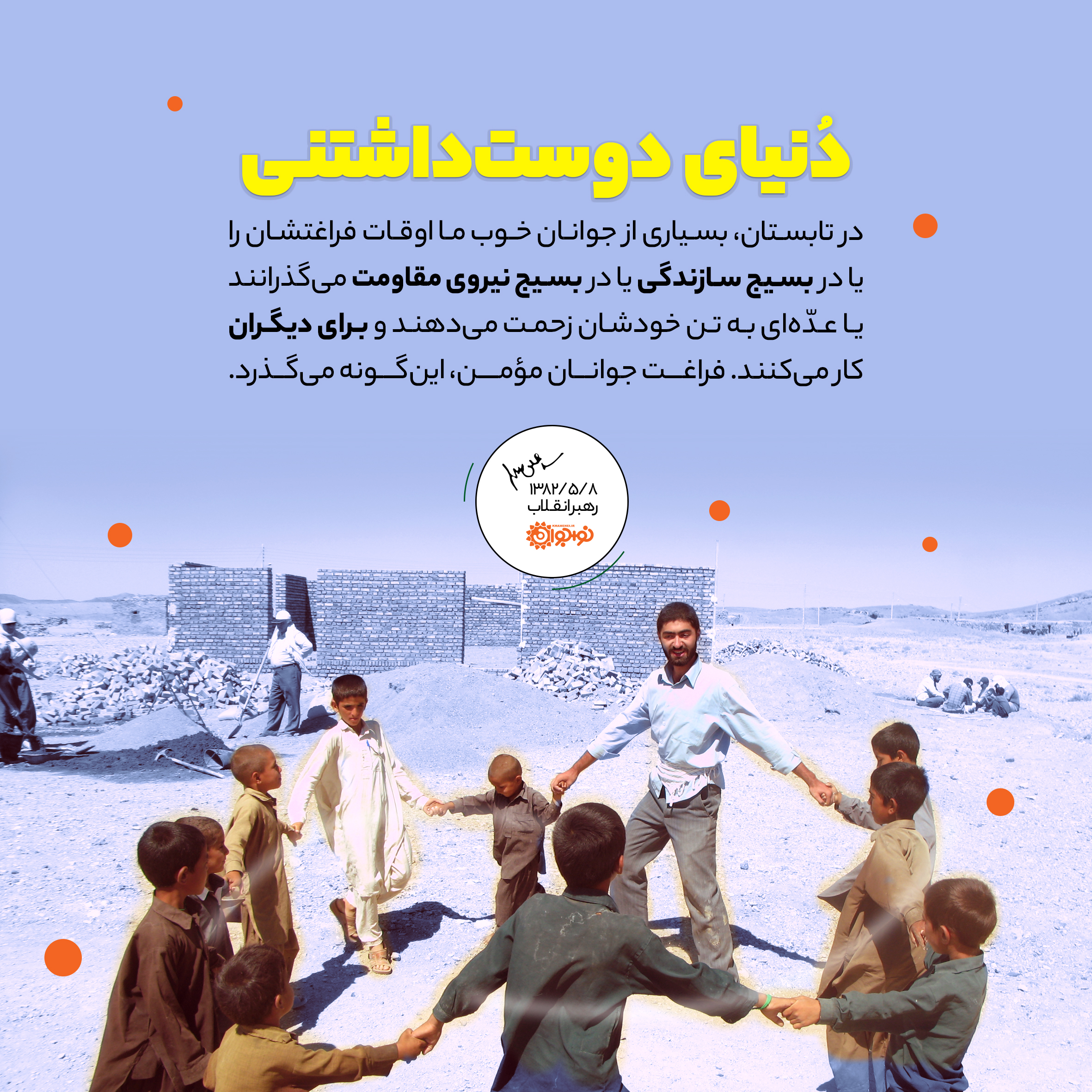 در تابستان، بسیاری از جوانان خوب ما اوقات فراغتشان را یا در بسیج سازندگی یا در بسیج نیروی مقاومت میگذرانند. یا عدّهای به تن خودشان زحمت میدهند و برای دیگران کار میکنند. فراغت جوانان مؤمن، این گونه میگذرد.