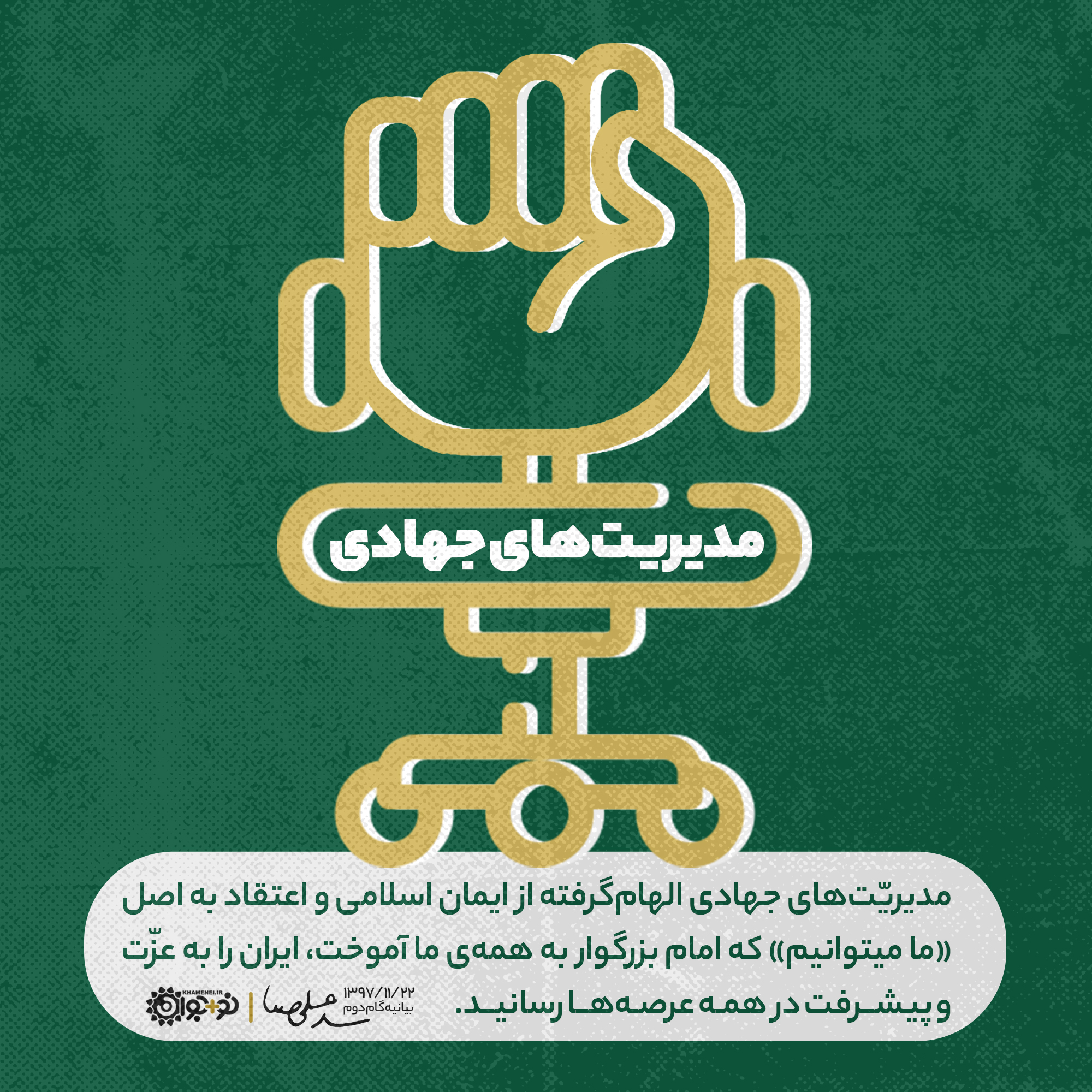 مدیریتهای جهادی الهام گرفته از ایمان اسلامی و اعتقاد به اصل «ما میتوانیم» که امام بزرگوار به همه ما آموخت، ایران را به عزّت و پیشرفت در همه عرصهها رسانید.