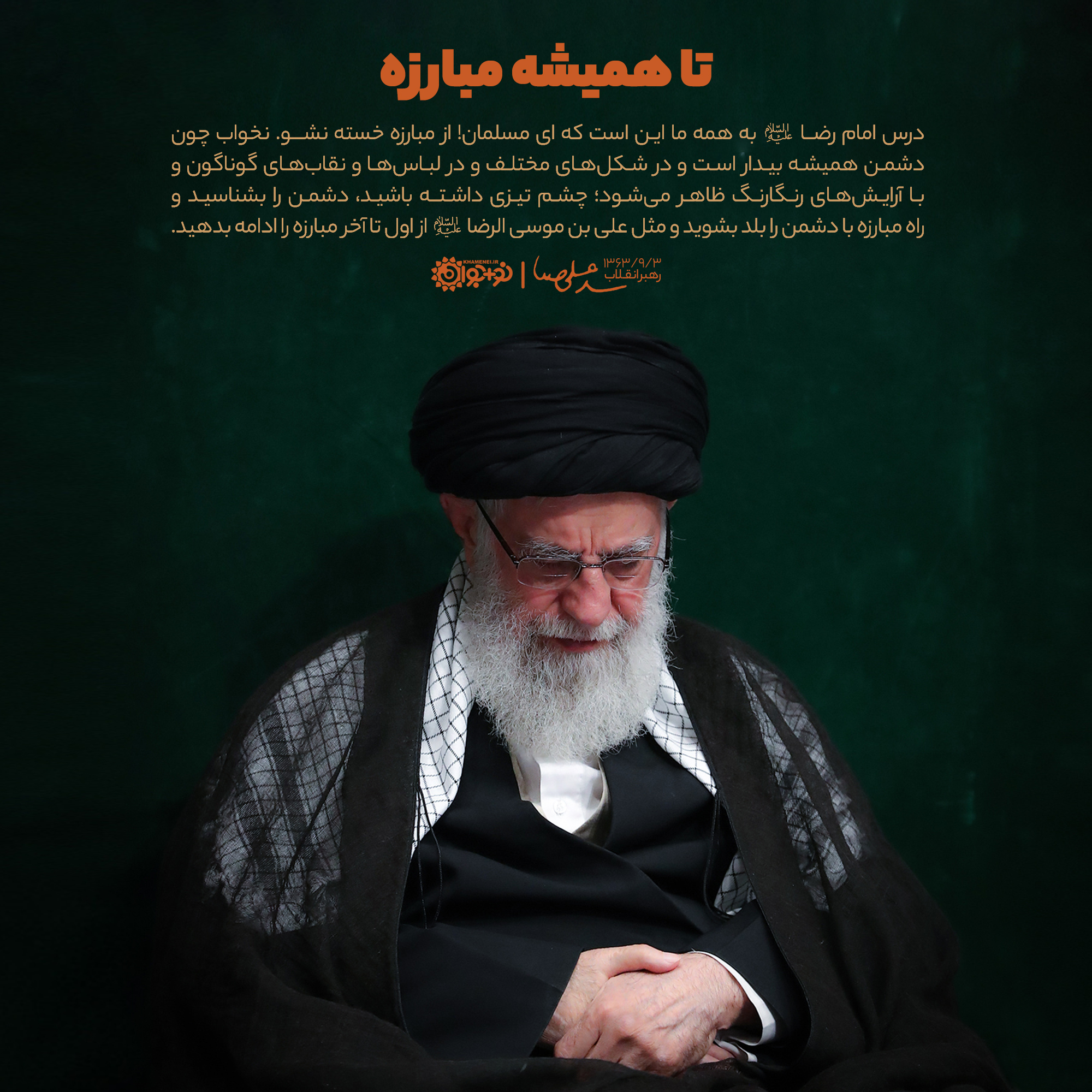 درس امام رضا علیهالسلام به همه ما ایـن است که ای مسلمان! از مبارزه خسته نشو. نخواب چون دشمن همیشه بیدار است و در شکلهای مختلف و در لباسها و نقابهای گوناگون و با آرایشهای رنگارنگ ظاهر میشود؛ چشم تیزی داشته باشید، دشمن را بشناسید و راه مبارزه با دشمن را بلد بشوید و مثل علیبنموسیالرضا علیهالسلام از اول تا آخر مبارزه را ادامه بدهید.