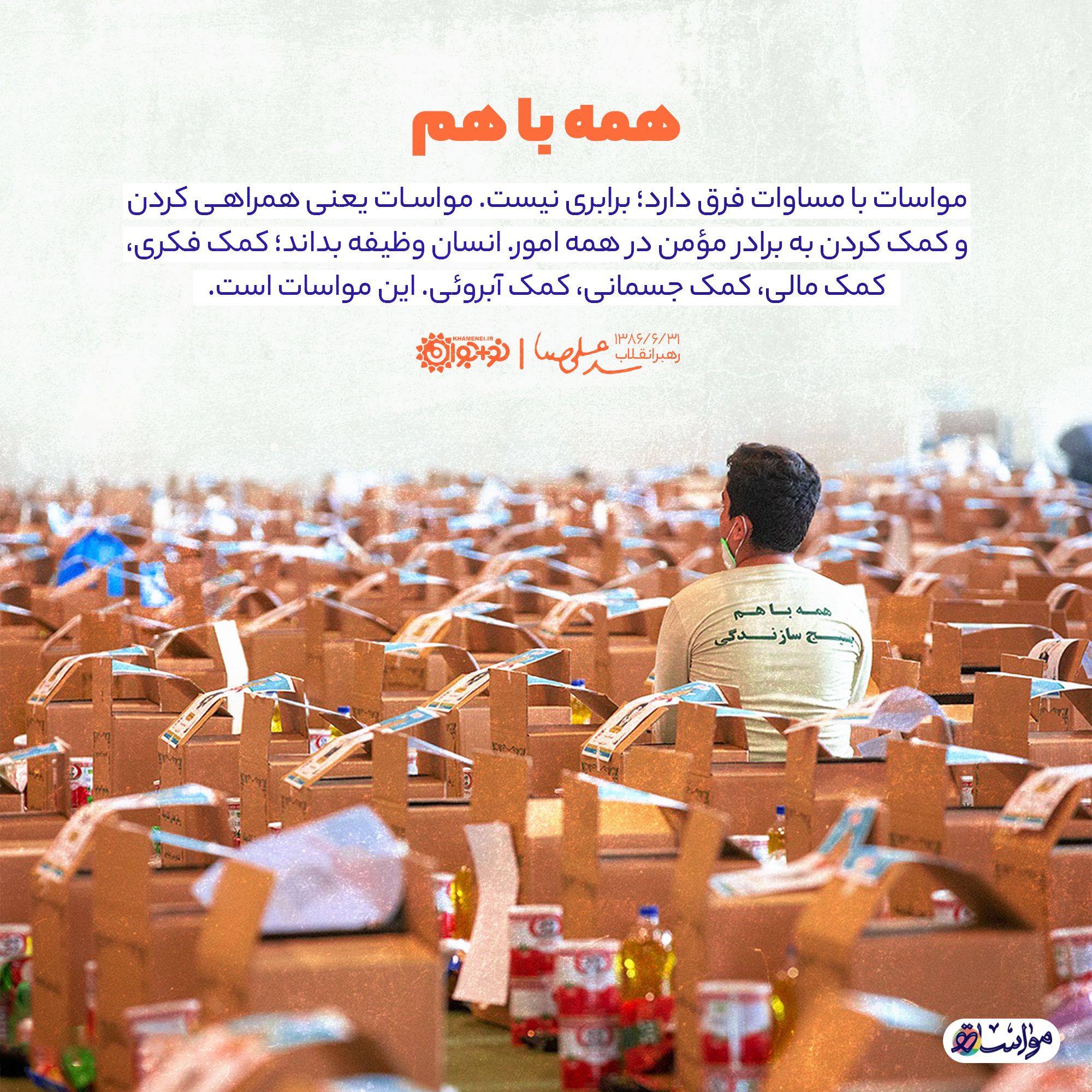 مواسات با مساوات فرق دارد؛ برابری نیست. مواسات یعنی همراهی کردن و کمک کردن به برادر مؤمن در همه امور. انسان وظیفه بداند؛ کمک فکری، کمک مالی، کمک جسمانی، کمک آبروئی، این مواسات است.