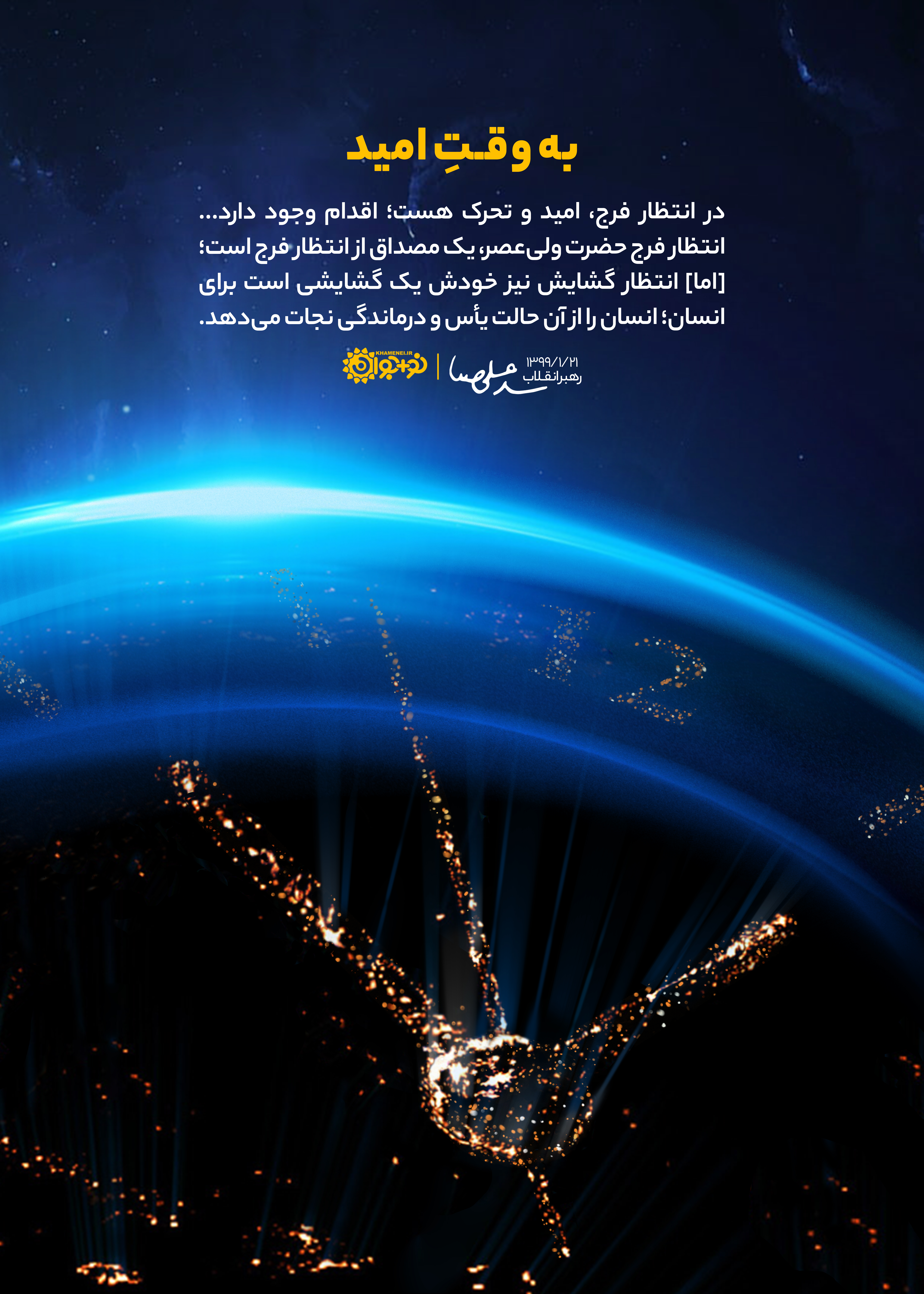 در انتظار فرج، امید و تحرّک هست، اقدام وجود دارد... انتظار فرج حضرت ولیّعصر؛ یک مصداق از انتظار فرج است. [اما] انتظار گشایش نیز خودش یک گشایشی است برای انسان؛ انسان را از آن حالت یأس و درماندگی نجات میدهد.