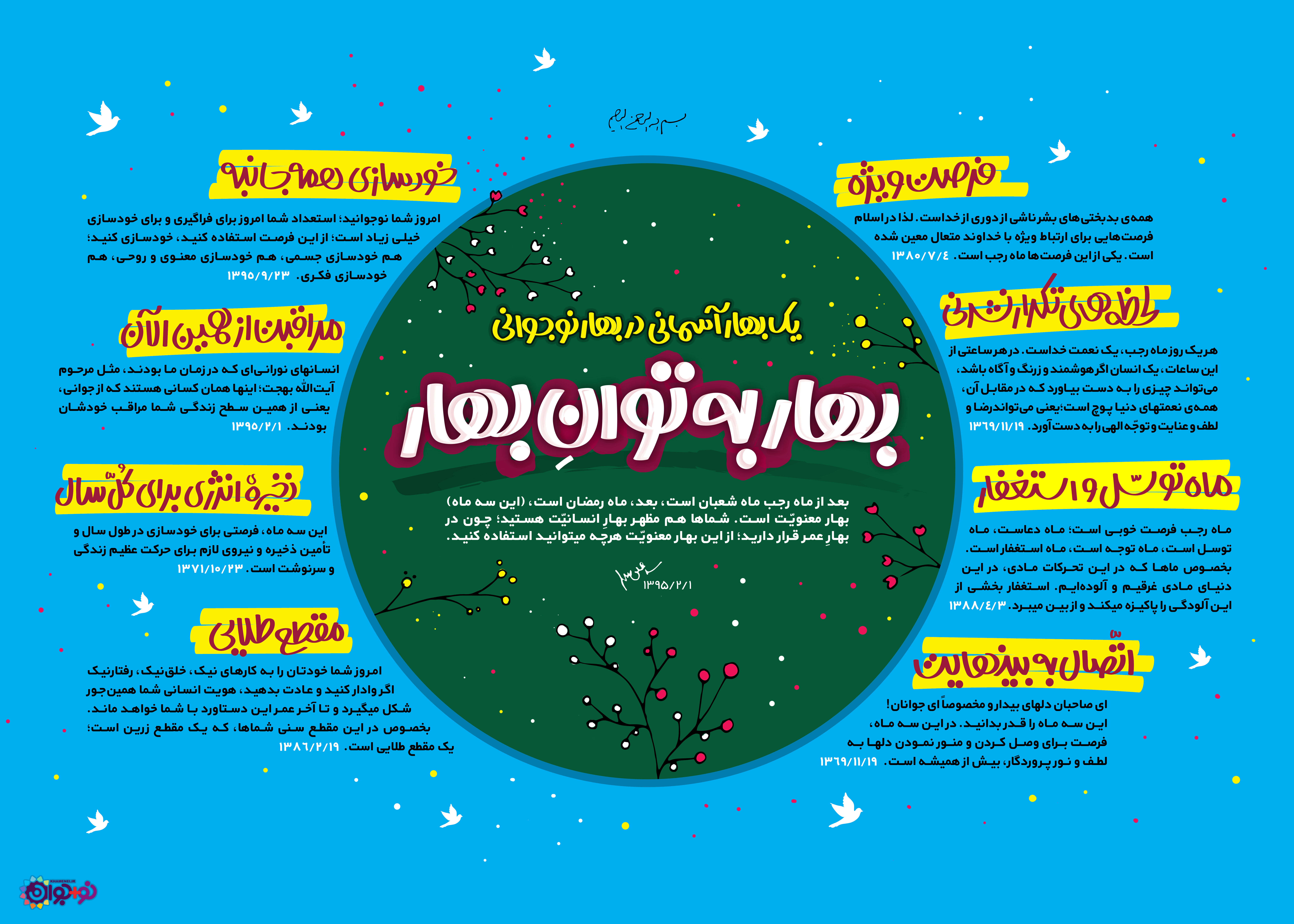 بعد از ماه رجب ماه شعبان است، بعد ماه رمضان است، بهار معنویت است. شماها هم مظهر بهار انسانیت هستید؛ چون در بهار عمر قرار دارید؛ از این بهار معنویت هرچه میتوانید استفاده کنید.