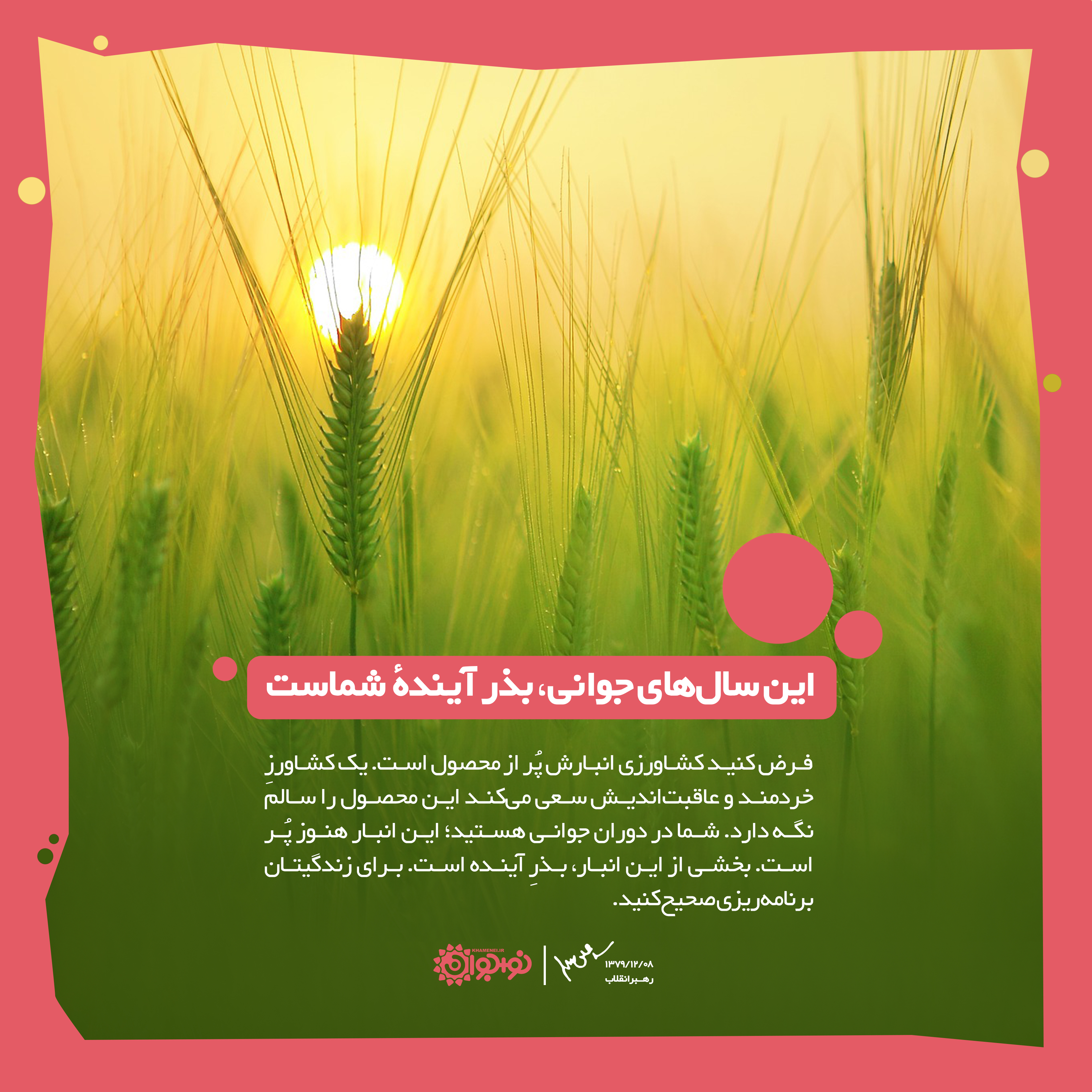 فرض کنید کشاورزی انبارش پُر از محصول است؛ یک کشاورزِ خردمند و عاقبتاندیش سعی میکند این محصول را سالم نگه دارد. شما در دوران جوانی هستید؛ این انبار هنوز پُر است. بخشی از این انبار بذرِ آینده است. برای زندگیتان برنامهریزی صحیح کنید.