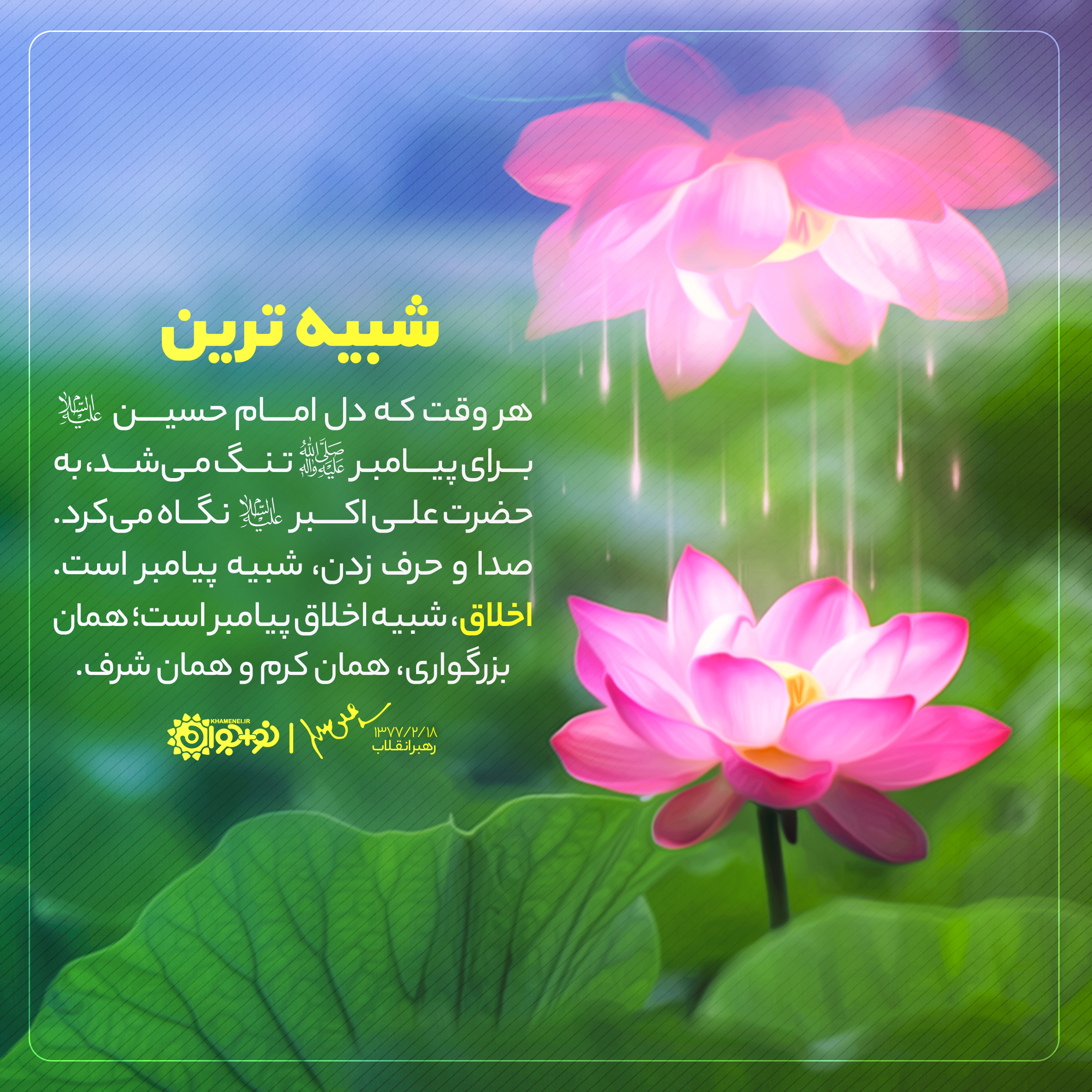 هر وقت که دل امام حسین علیهالسلام برای پیامبر صلیاللهعلیهوآله تنگ میشد، به حضرت علیاکبر علیهالسلام نگاه میکرد. صدا و حرف زدن، شبیه حرف زدن پیامبر است. اخلاق، شبیه اخلاق پیامبر است؛ همان بزرگواری، همان کَرَم و همان شرف.