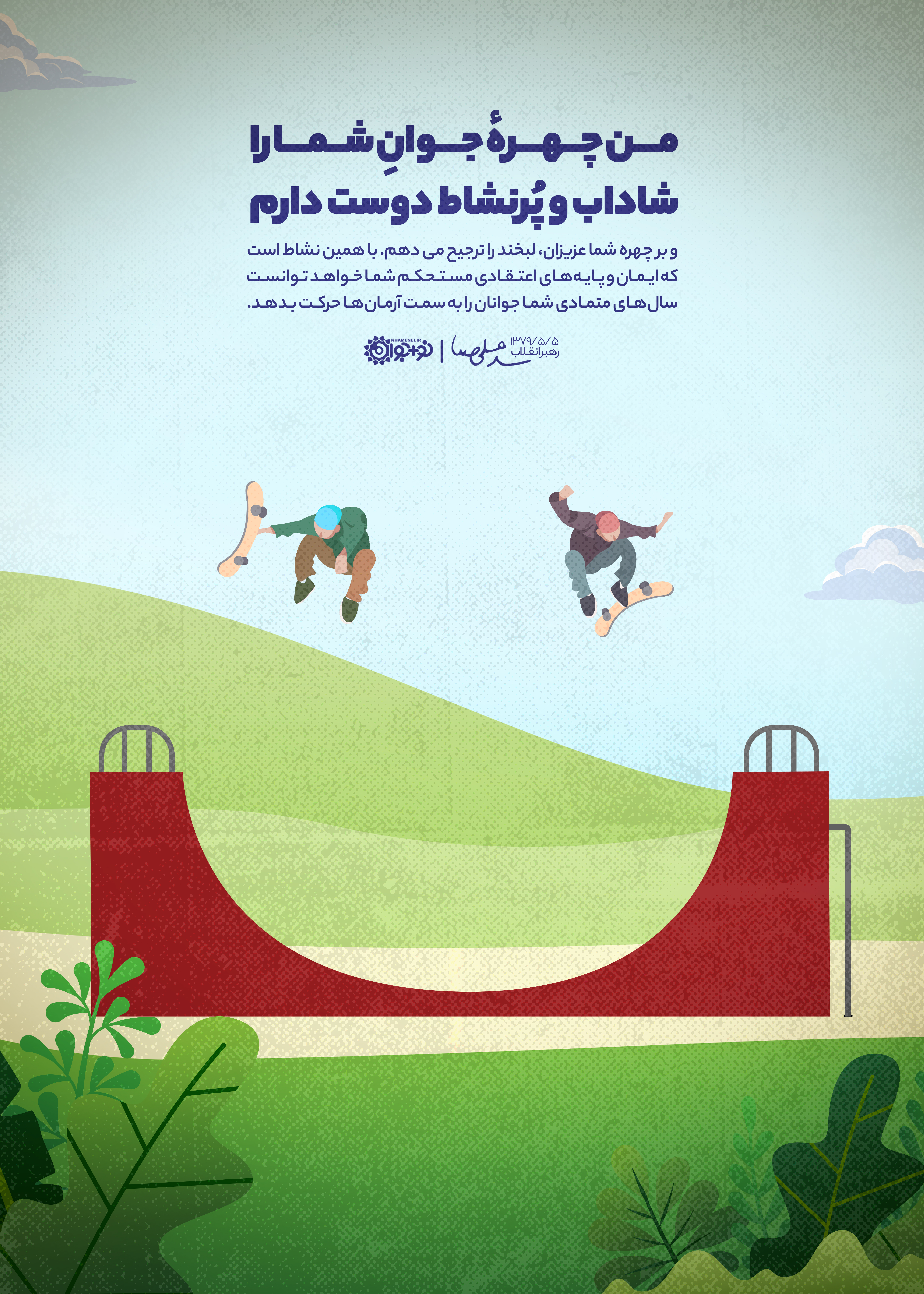 من چهره جوان شما را شاداب و پُرنشاط دوست دارم و بر چهره شما عزیزان، لبخند را ترجیح میدهم. با همین نشاط است که ایمان و پایههای اعتقادی مستحکم شما خواهد توانست سالهای متمادی شما جوانان را به سمت آرمانها حرکت بدهد.