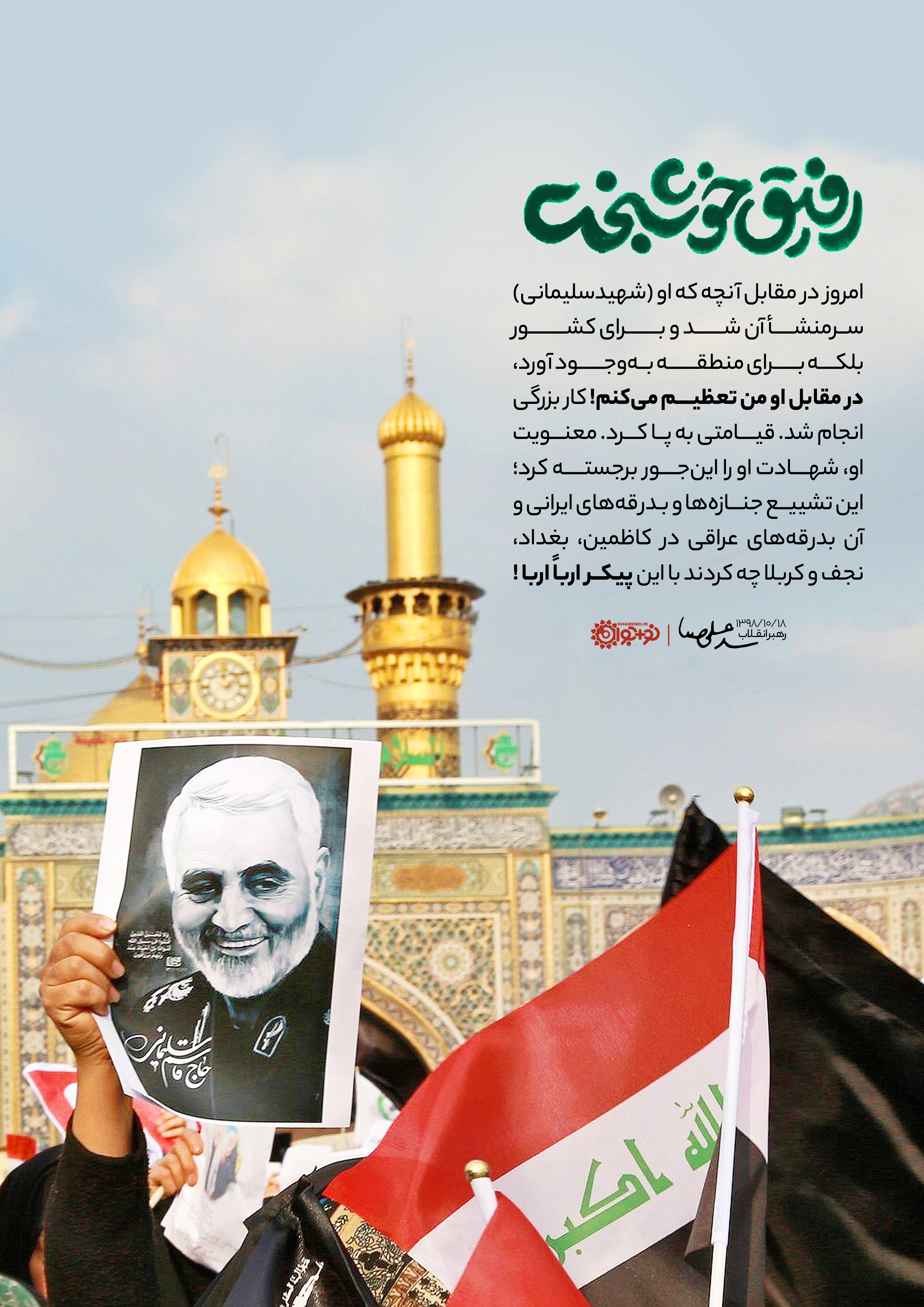امروز در مقابل آنچه که او (شهیدسلیمانی) سرمنشأ آن شد و برای کشور بلکه برای منطقه به وجود آورد، در مقابل او من تعظیم میکنم! کار بزرگی انجام شد. قیامتی به پا کرد. معنویّت او، شهادت او را اینجور برجسته کرد؛ این تشییع جنازهها و بدرقههای ایرانی و آن بدرقههای عراقی در کاظمین، بغداد، نجف و کربلا چه کردند با این پیکر اِرباًاِربا!