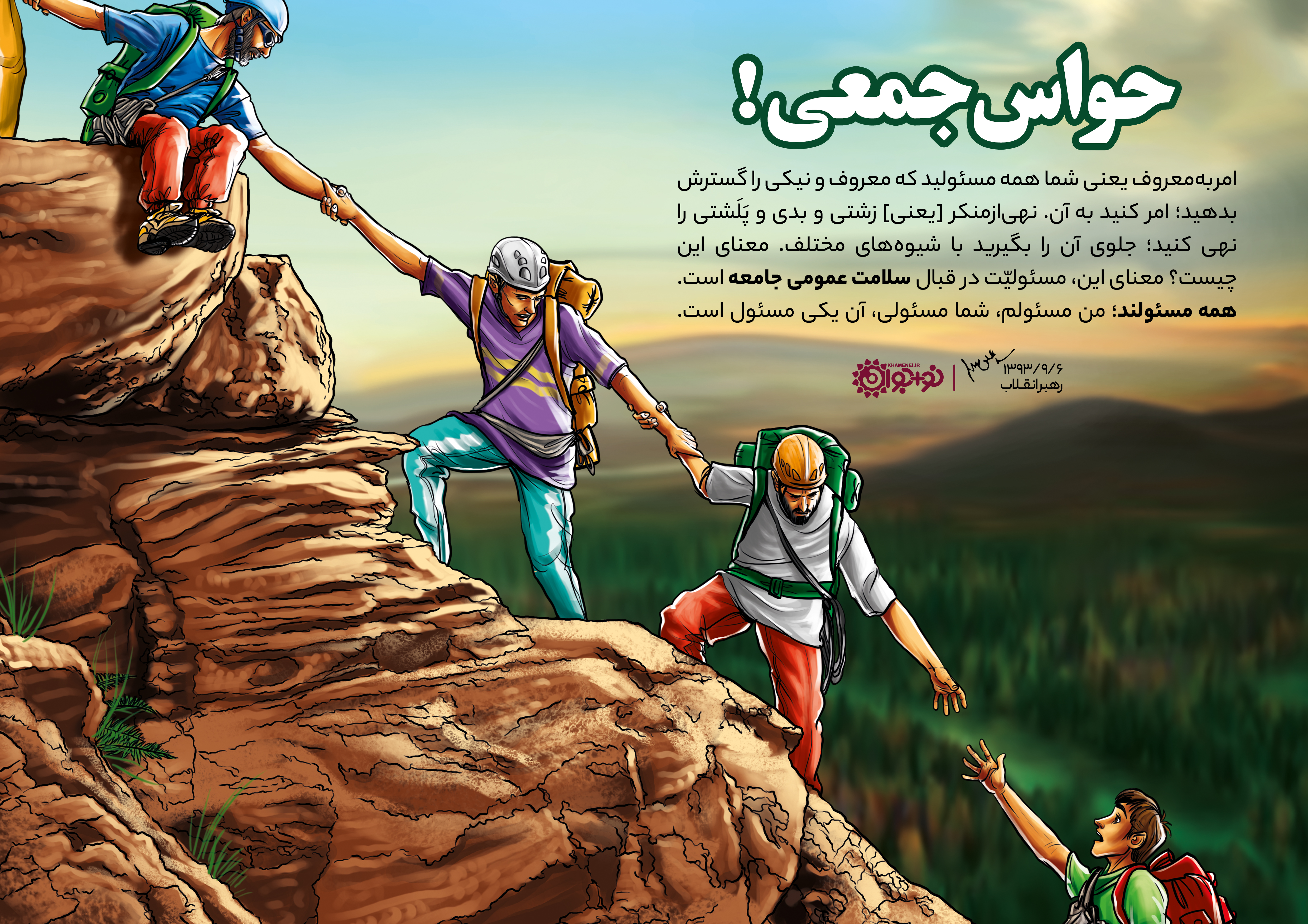 امربهمعروف یعنی شما همه مسئولید که معروف و نیکی را گسترش بدهید، امر کنید به آن؛ نهی از منکر [یعنی] زشتی، بدی، پلشتی را نهی کنید؛ جلوی آن را بگیرید با شیوههای مختلف. معنای این چیست؟ معنای این، مسئولیت در قبال سلامت عمومی جامعه است. همه مسئولاند: من مسئولم؛ شما مسئولی؛ آنیکی مسئول است.