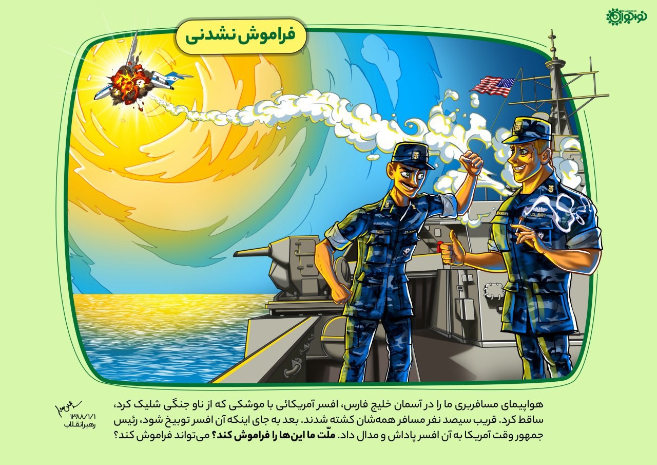 هواپیمای مسافربری ما را در آسمان خلیجفارس افسر آمریکائی با موشکی که از ناو جنگی شلیک کرد، ساقط کرد. قریب سیصد نفر مسافر همهشان کشته شدند. بعد بهجای اینکه آن افسر توبیخ شود، رئیسجمهور وقت آمریکا به آن افسر پاداش و مدال داد. ملت ما اینها را فراموش کند؟ میتواند فراموش کند؟