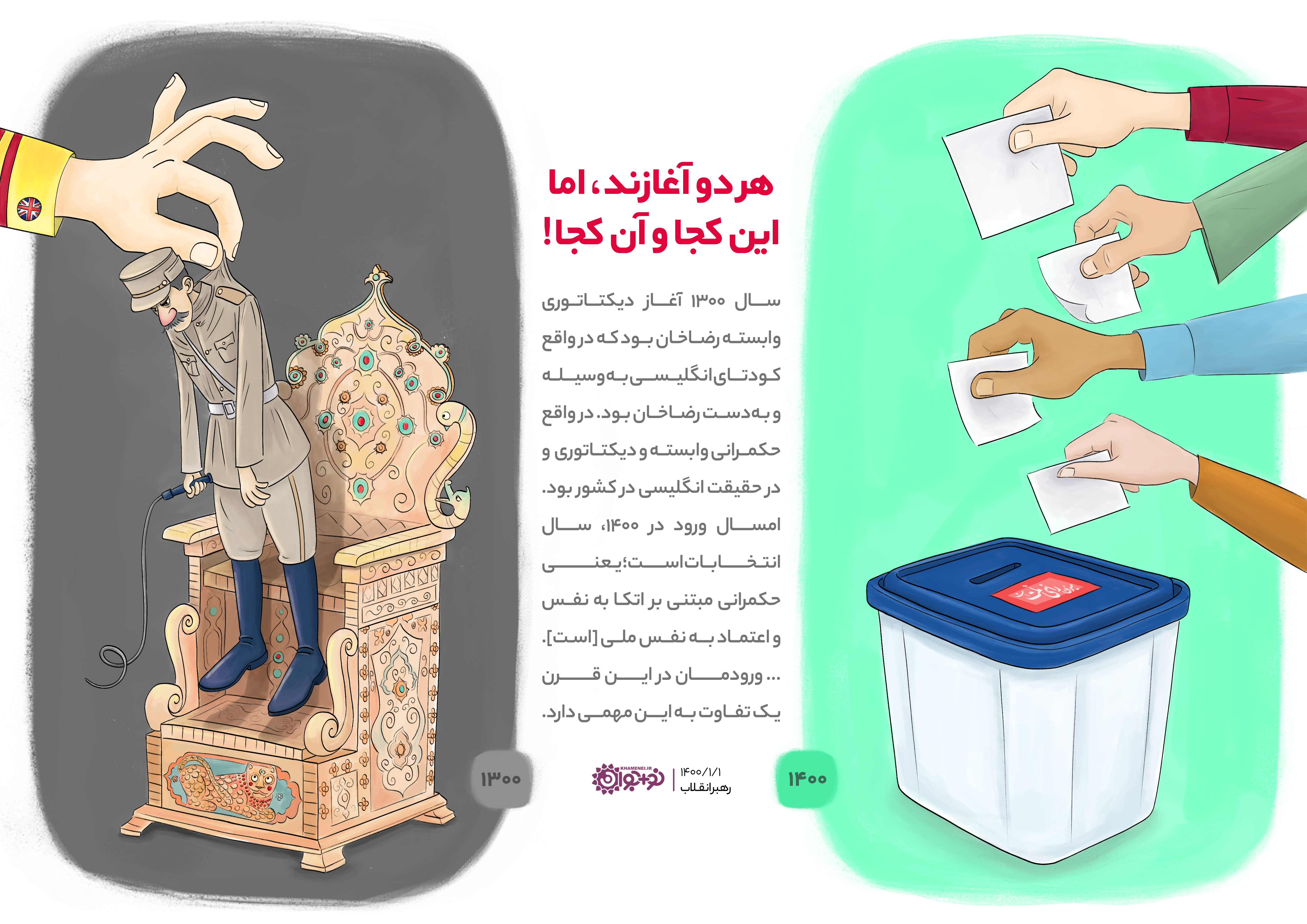 سال ۱۳۰۰ آغاز دیکتاتوری وابسته رضاخان بود که در واقع کودتای انگلیسی بهوسیله و بهدست رضاخان بود. در واقع حکمرانی وابسته و دیکتاتوری و در حقیقت انگلیسی در کشور بود. امسال ورود در ۱۴۰۰، سال انتخابات است؛ یعنی حکمرانی مبتنی بر اتکا به نفس و اعتماد به نفس ملی [اسـت] ... ورودمان در این قرن یک تفاوت به این مهمی دارد.