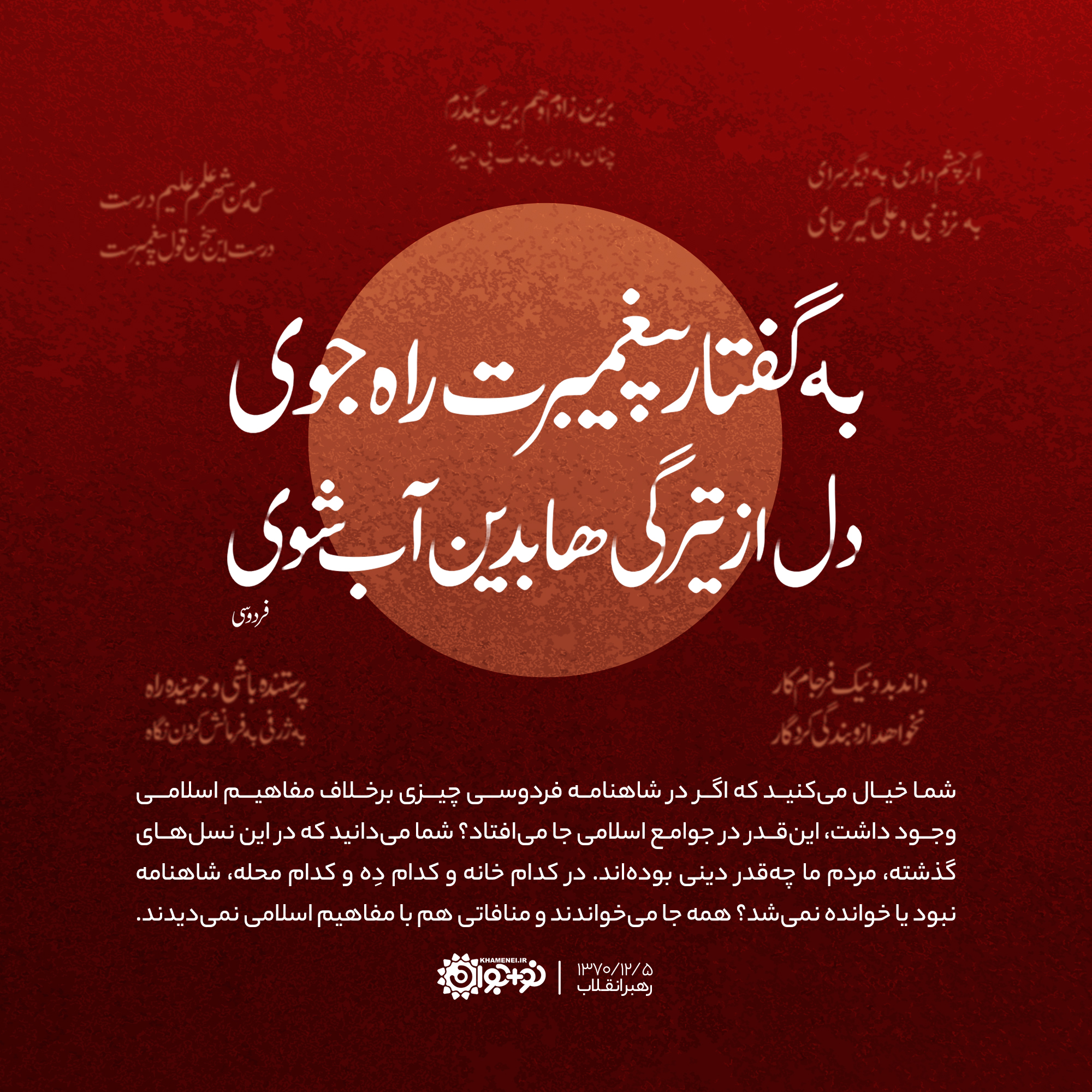 شما خیال میکنید که اگر در شاهنامه فردوسی چیزی برخلاف مفاهیم اسلامی وجود داشت، اینقدر در جوامع اسلامی جا میافتاد؟ شما میدانید که در این نسلهای گذشته، مردم ما چهقدر دینی بودهاند. در کدام خانه و کدام ده و کدام محله، شاهنامه نبود یا خوانده نمیشد؟ همه جا میخواندند و منافاتی هم با مفاهیم اسلامی نمیدیدند.