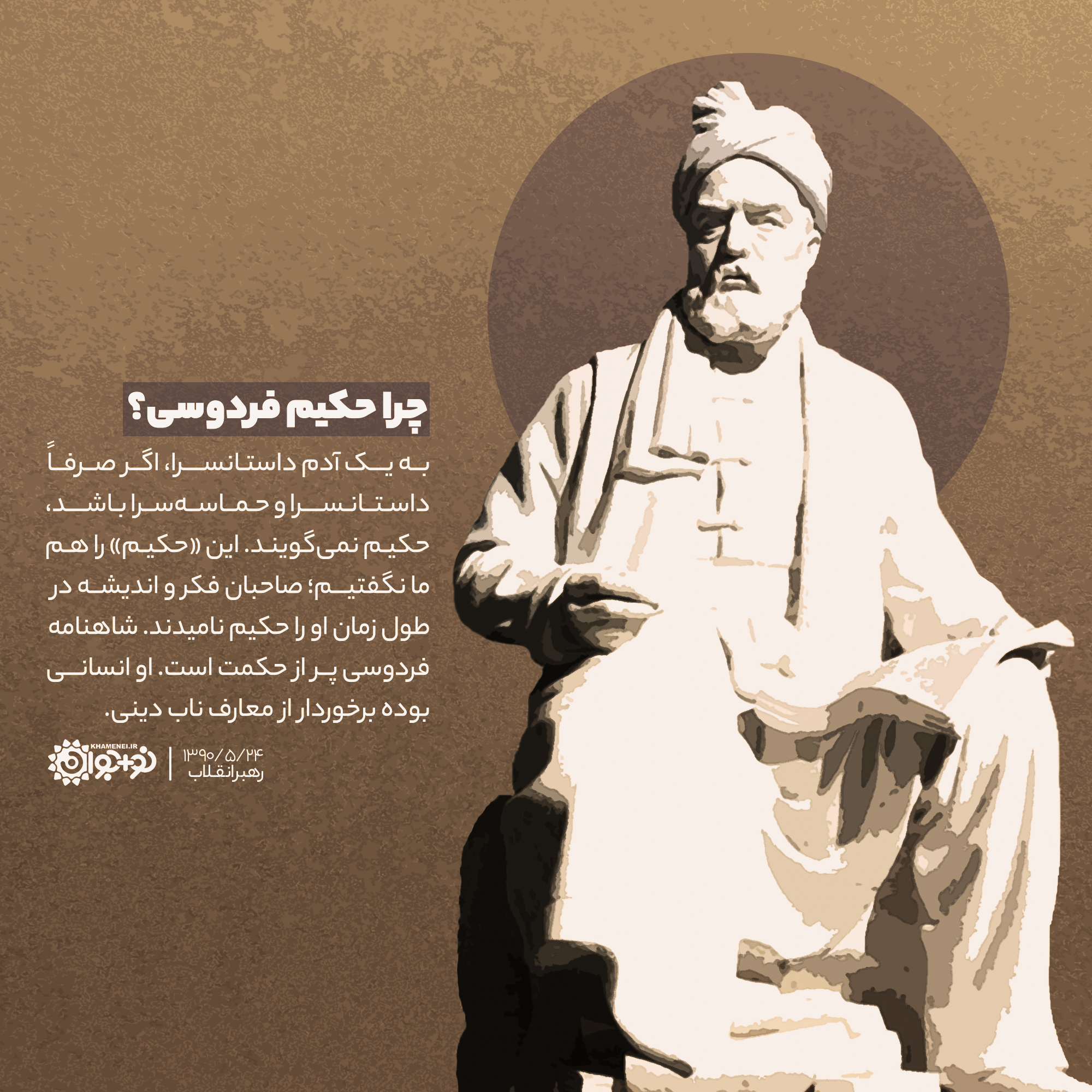 به یک آدم داستانسرا، اگر صرفاً داستانسرا و حماسهسرا باشد، حکیم نمیگویند. این «حکیم» را هم ما نگفتیم؛ صاحبان فکر و اندیشه در طول زمان او را حکیم نامیدند. شاهنامه فردوسی پر از حکمت است. او انسانی بوده برخوردار از معارف ناب دینی.
