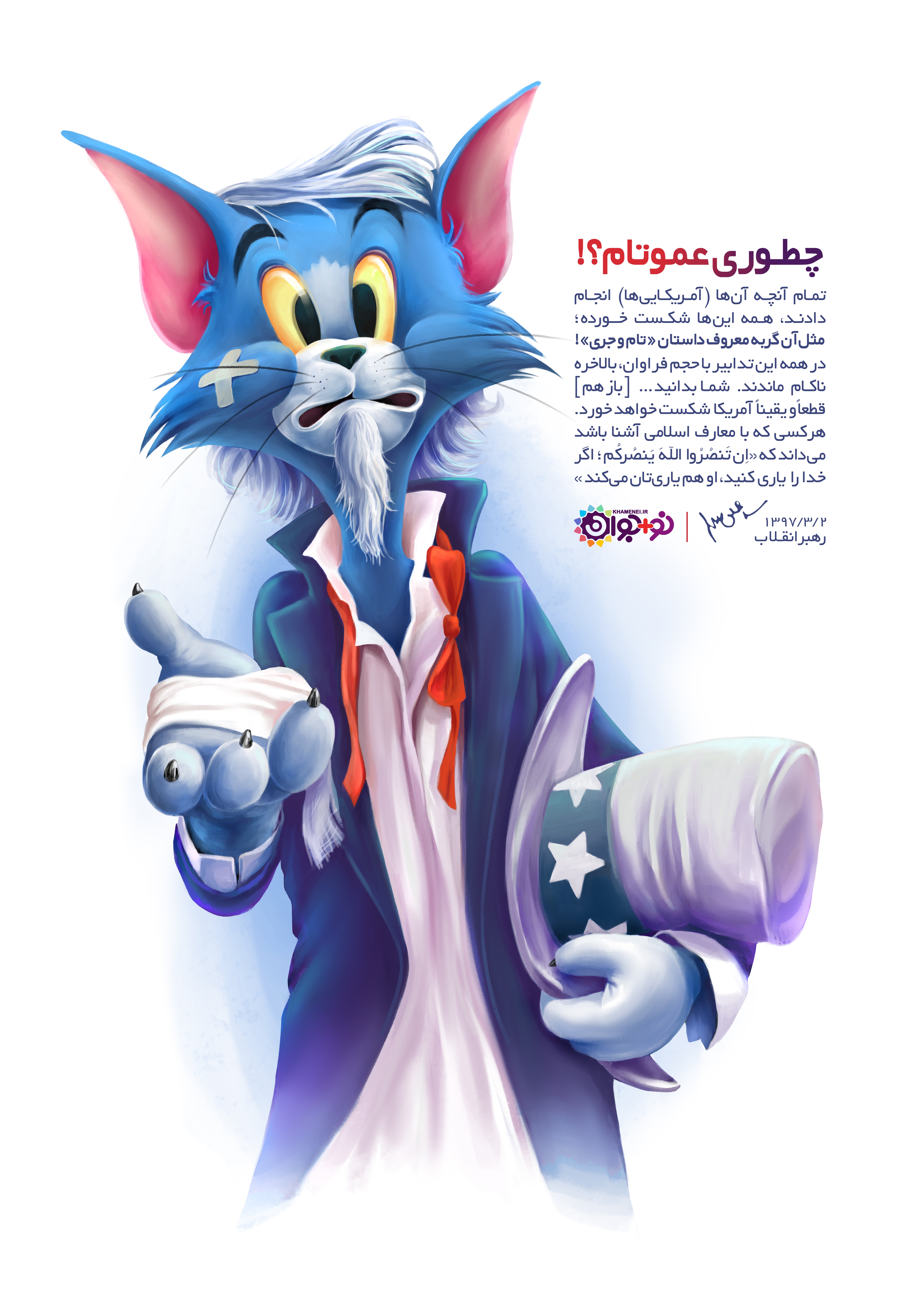 تمام آنچه آنها [آمریکاییها] انجام دادند، همه اینها شکست خورده؛ مثل آن گربه معروف داستان «تام و جری»! در همه این تدابیر با حجم فراوان، بالاخره ناکام ماندند. شما بدانید... [بازهم] قطعاً و یقیناً آمریکا شکست خواهد خورد.