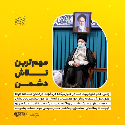 وقتی افکار عمومی یک ملت در اختیار بیگانه قرار گرفت، حرکت آن ملت هم طبعا طبق میل آن بیگانه پیش خواهد رفت ... دشمنان ما امروز بیشترین تحرکشان علیه ما، بیش از تحرکات امنیتی و اقتصادی، تحرکات تبلیغاتی و جنگ نرم و تبلیغات رسانهای است برای اینکه بر افکار عمومی مردم مسلط بشوند.