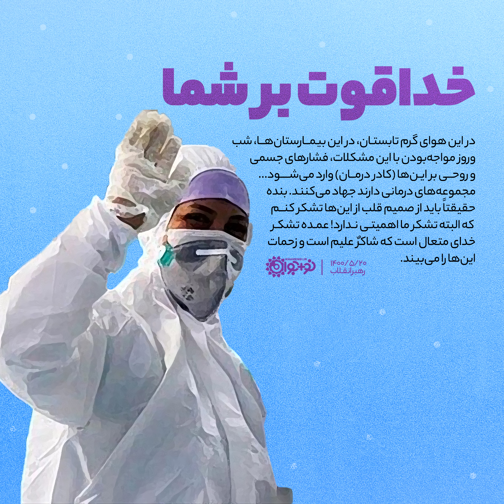در این هوای گرم تابستان، در این بیمارستانها، شب و روز مواجهبودن با این مشکلات حقیقتاً یک مسئله مهمّی است؛ فشارهای جسمی و روحی بر اینها [کادر درمان] وارد میشود و واقعاً مجموعههای درمانی، پزشک، پرستار و امثال اینها دارند جهاد میکنند. بنده حقیقتاً باید از صمیم قلب از اینها تشکّر کنم که البتّه تشکّر ما اهمّیّتی ندارد؛ عمده، تشکّر خدای متعال است که شاکرٌ علیم است و زحمات اینها را میبیند.