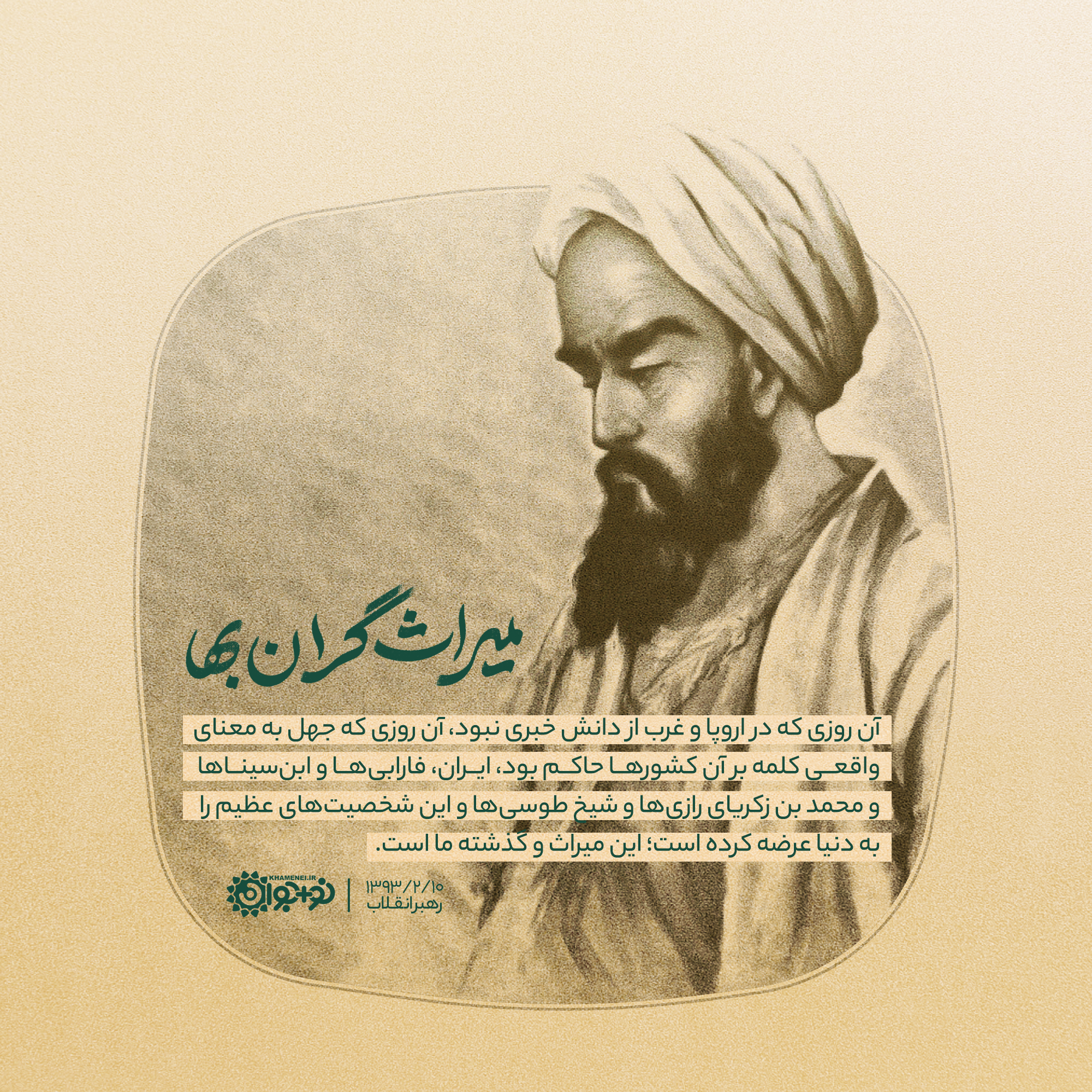 آن روزی که در اروپا و غرب از دانش خبری نبود، آن روزی که جهل بهمعنای واقعی کلمه بر آن کشورها حاکم بود، ایران، فارابیها و ابنسیناها و محمّدبنزکریّای رازیها و شیخ طوسیها و این شخصیّتهای عظیم را به دنیا عرضه کرده است؛ این میراث ماست.