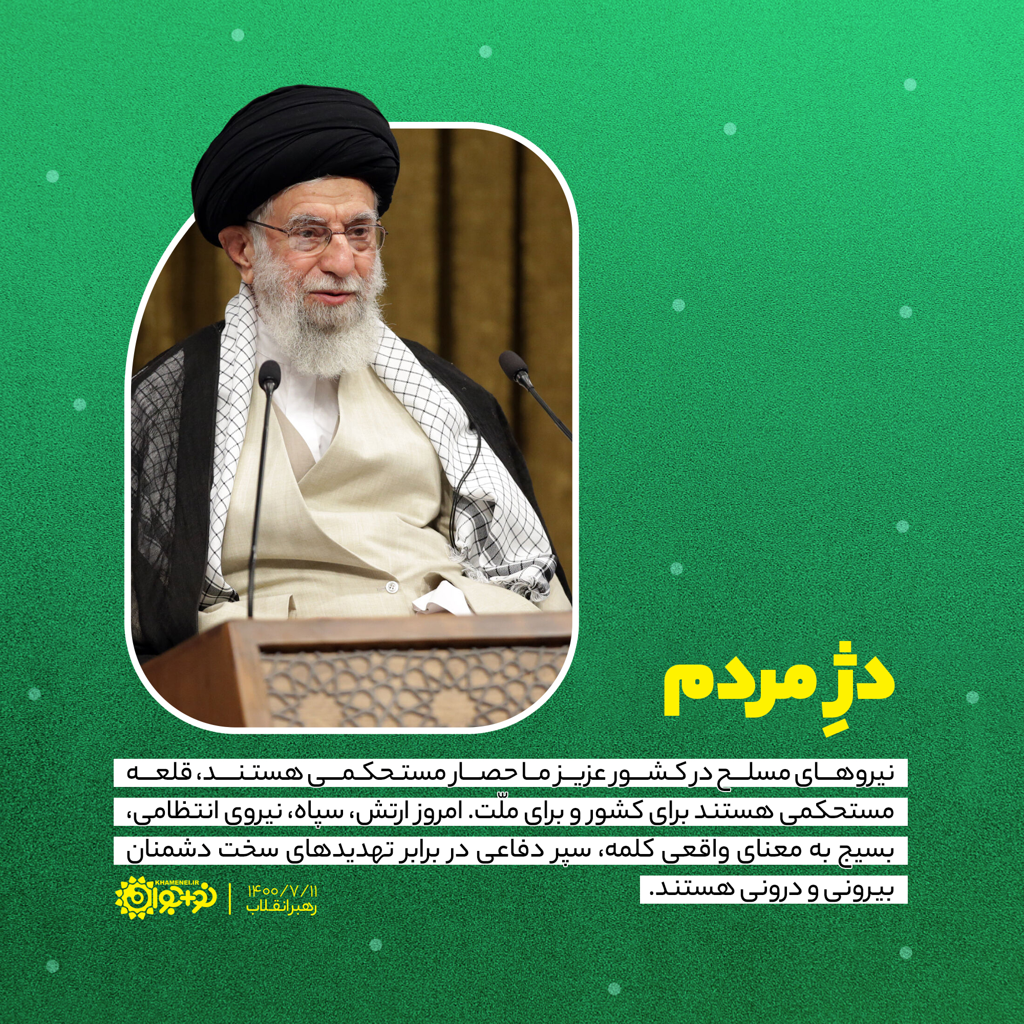 نیروهای مسلّح در کشور عزیز ما حصار مستحکمی هستند، قلعه مستحکمی هستند برای کشور و برای ملّت ... امروز ارتش، سپاه، نیروی انتظامی، بسیج بهمعنای واقعی کلمه، سپر دفاعی در برابر تهدیدهای سخت دشمنان بیرونی و درونی هستند.