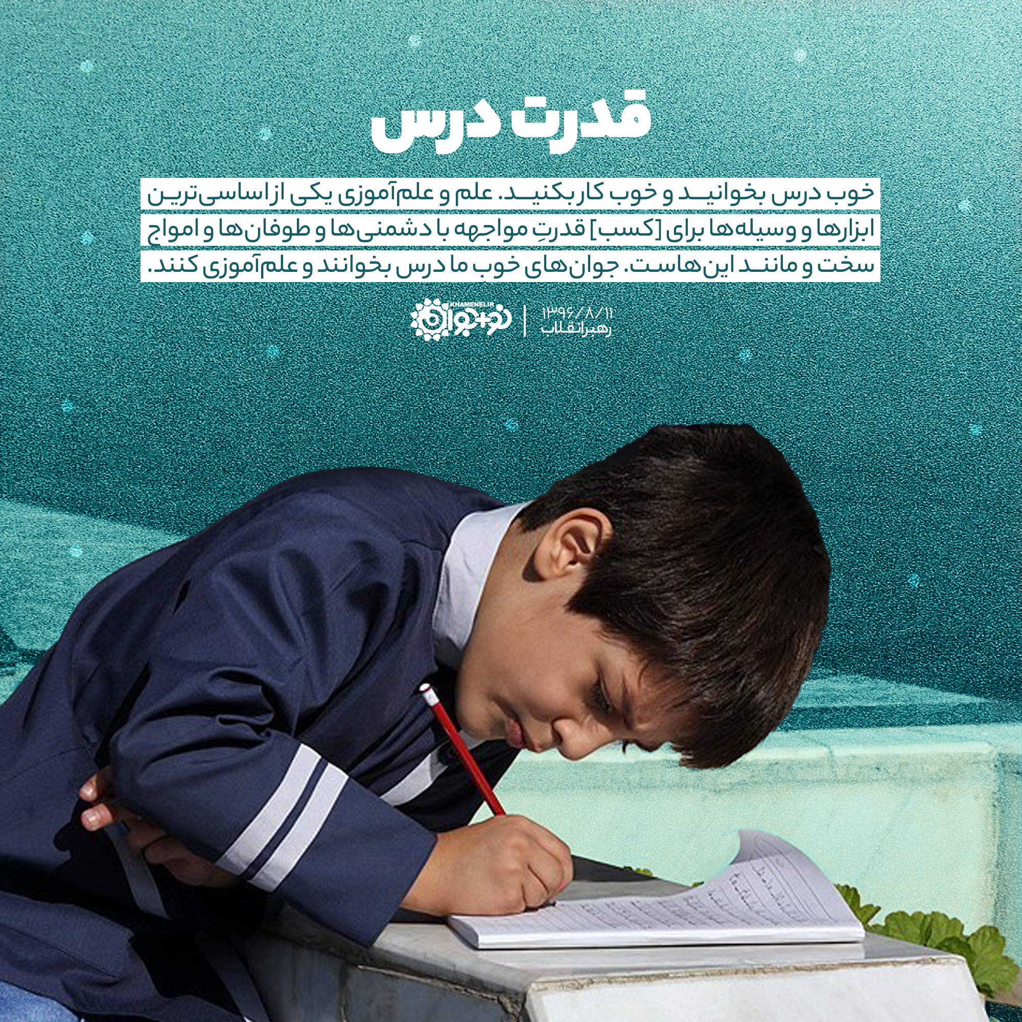 خوب درس بخوانید، خوب کار بکنید. علم و علمآموزی یکی از اساسیترین ابزارها و وسیلهها برای [کسب] قدرتِ مواجهه با دشمنیها و با طوفانها و با امواج سخت و مانند اینهاست. جوانهای خوبِ ما درس بخوانند و علمآموزی کنند.