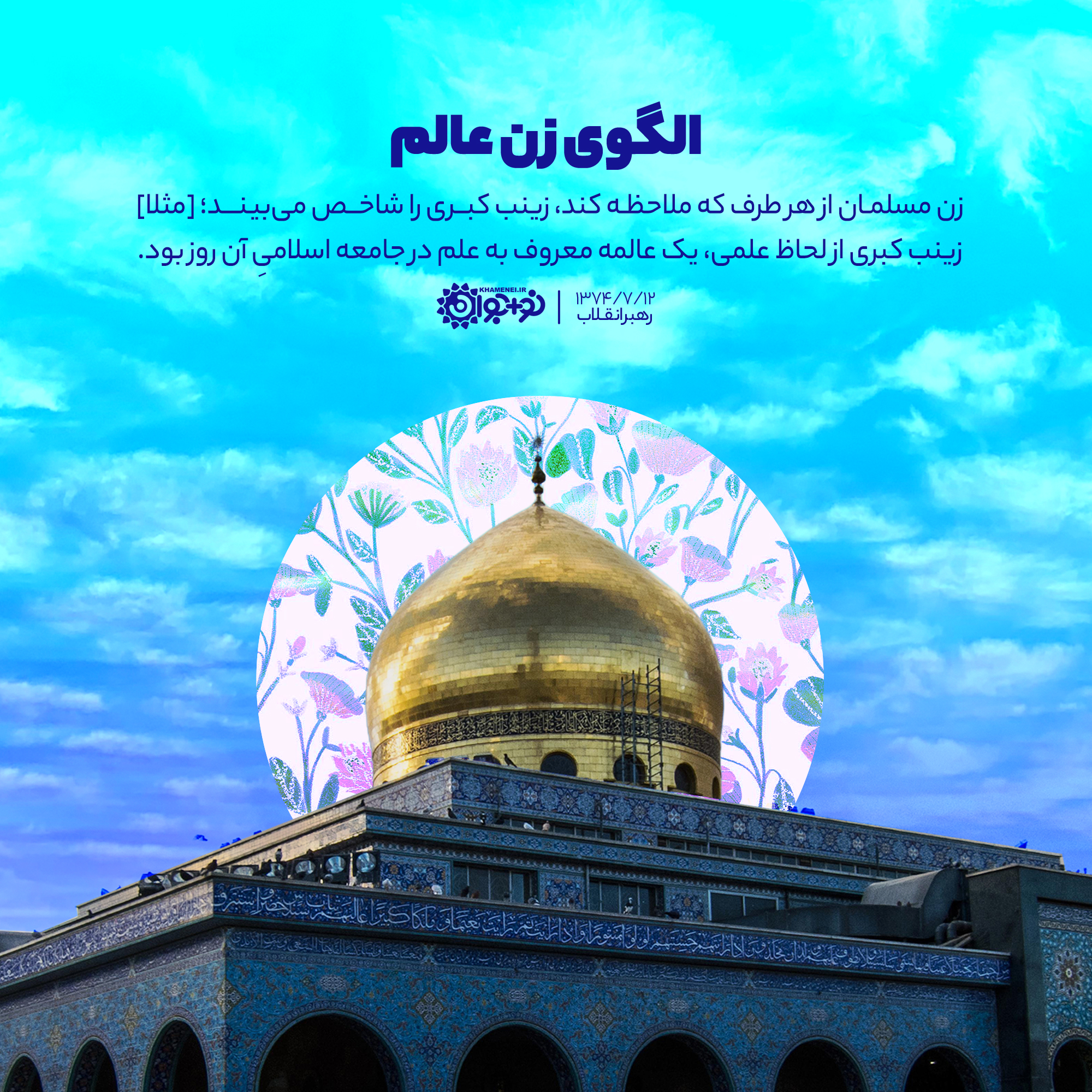 زن مسلمان، از هر طرف که ملاحظه کند، زینب کبری را شاخص میبیند؛ [مثلاً] زینب کبری از لحاظ علمی، یک عالمه معروف به علم در جامعه اسلامیِ آن روز بود.