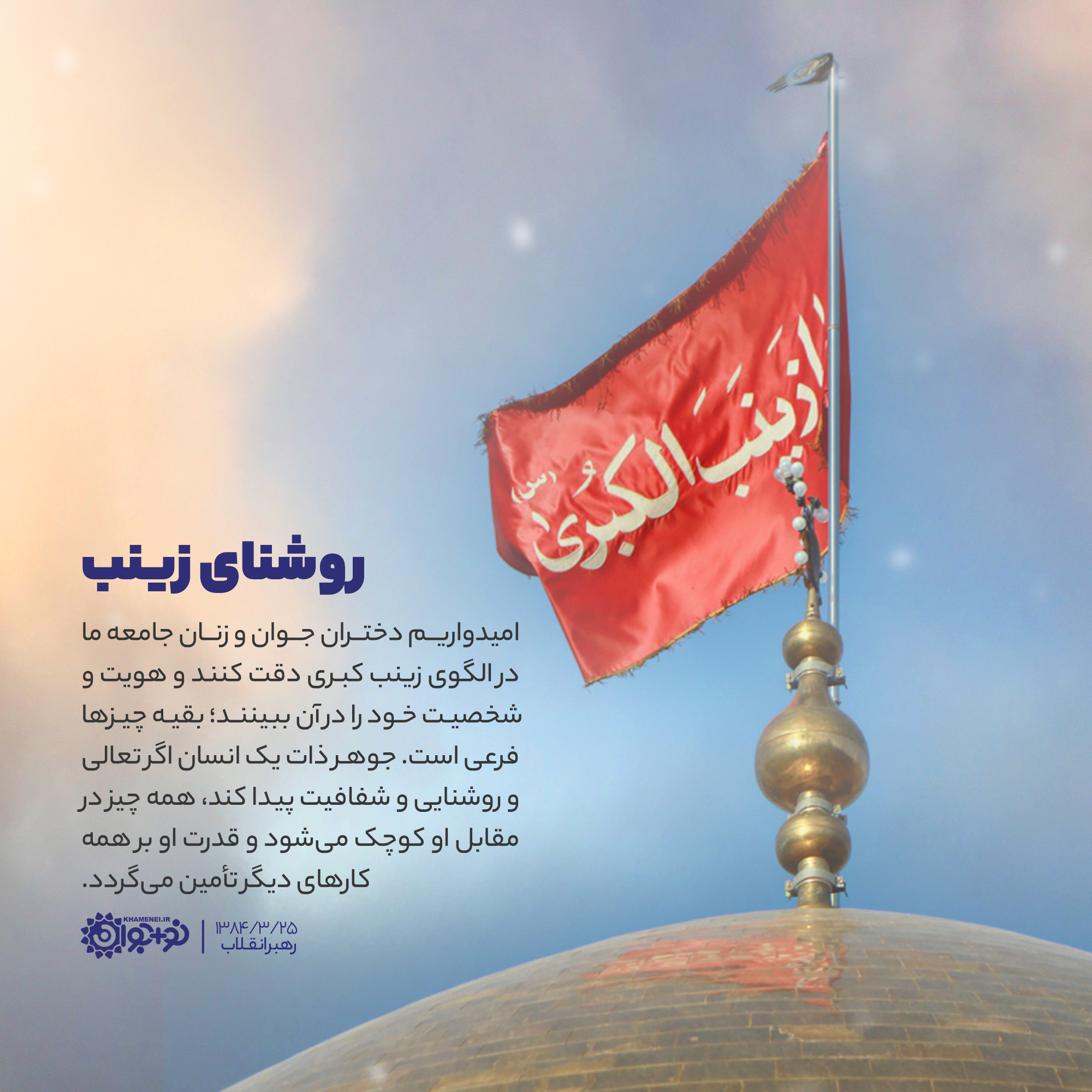 امیدواریم دختران جوان و زنان جامعه ما در الگوی زینب کبری دقت کنند و هویت و شخصیت خود را در آن ببینند؛ بقیه چیزها فرعی است. جوهر ذات یک انسان اگر تعالی و روشنایی و شفافیت پیدا کند، همهچیز در مقابل او کوچک میشود و قدرت او بر همه کارهای دیگر، برای او تأمین میگردد.