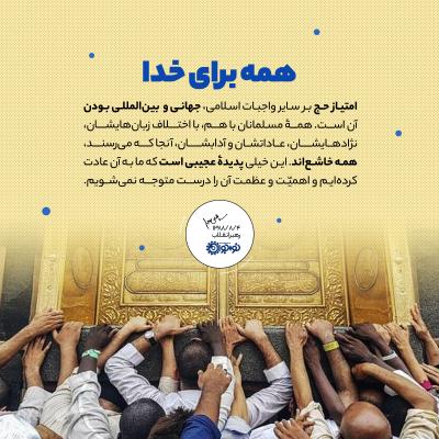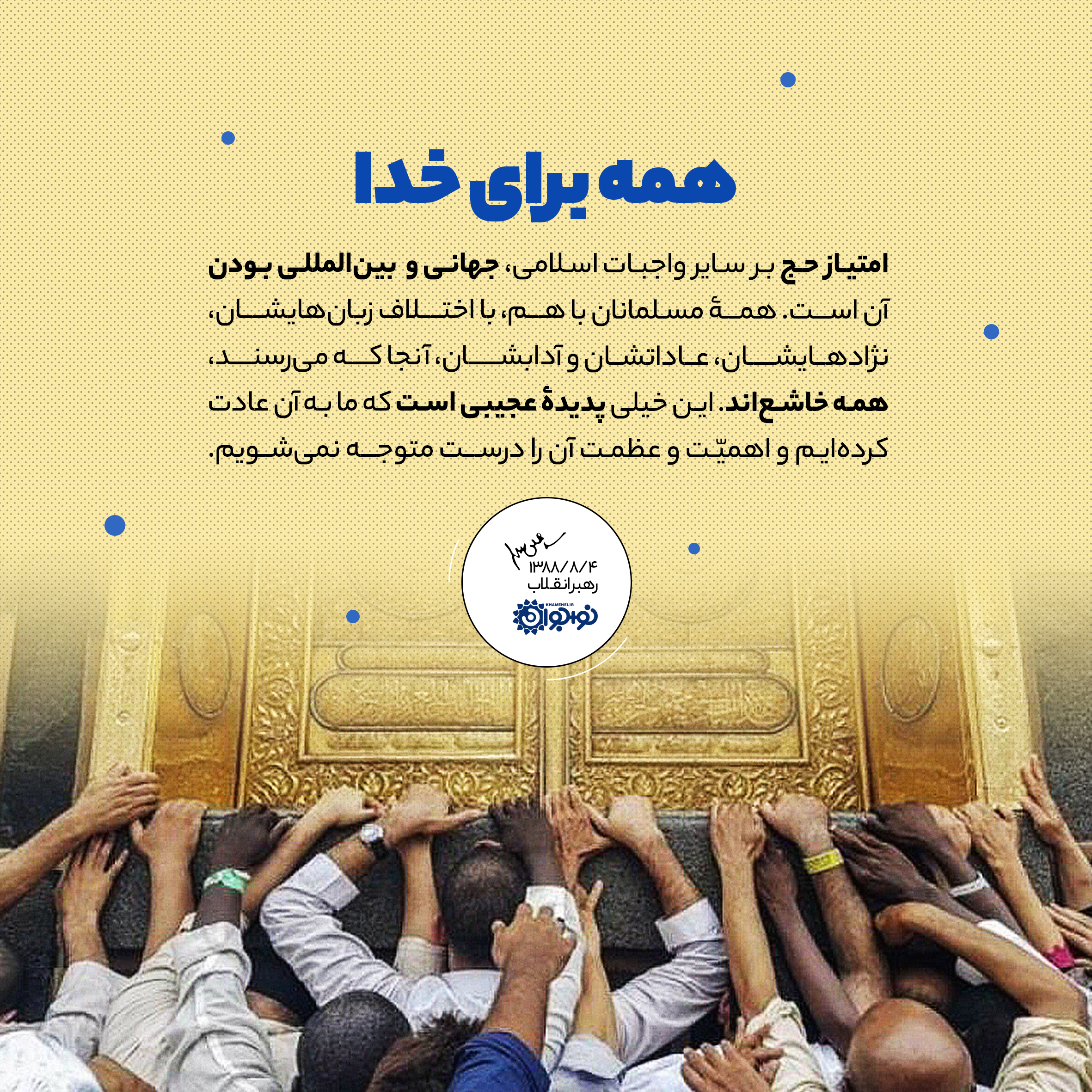 امتیاز حج بر سایر واجبات و فرائض اسلامی، جهانی و بینالمللی بودن آن است. همه مسلمانان با هم، با اختلاف زبانهایشان، نژادهایشان، عاداتشان، آدابشان، آنجا که میرسند، همه خاشعاند. این خیلی پدیده عجیبی است که ما به آن عادت کردهایم و اهمیت و عظمت آن را درست متوجه نمیشویم.