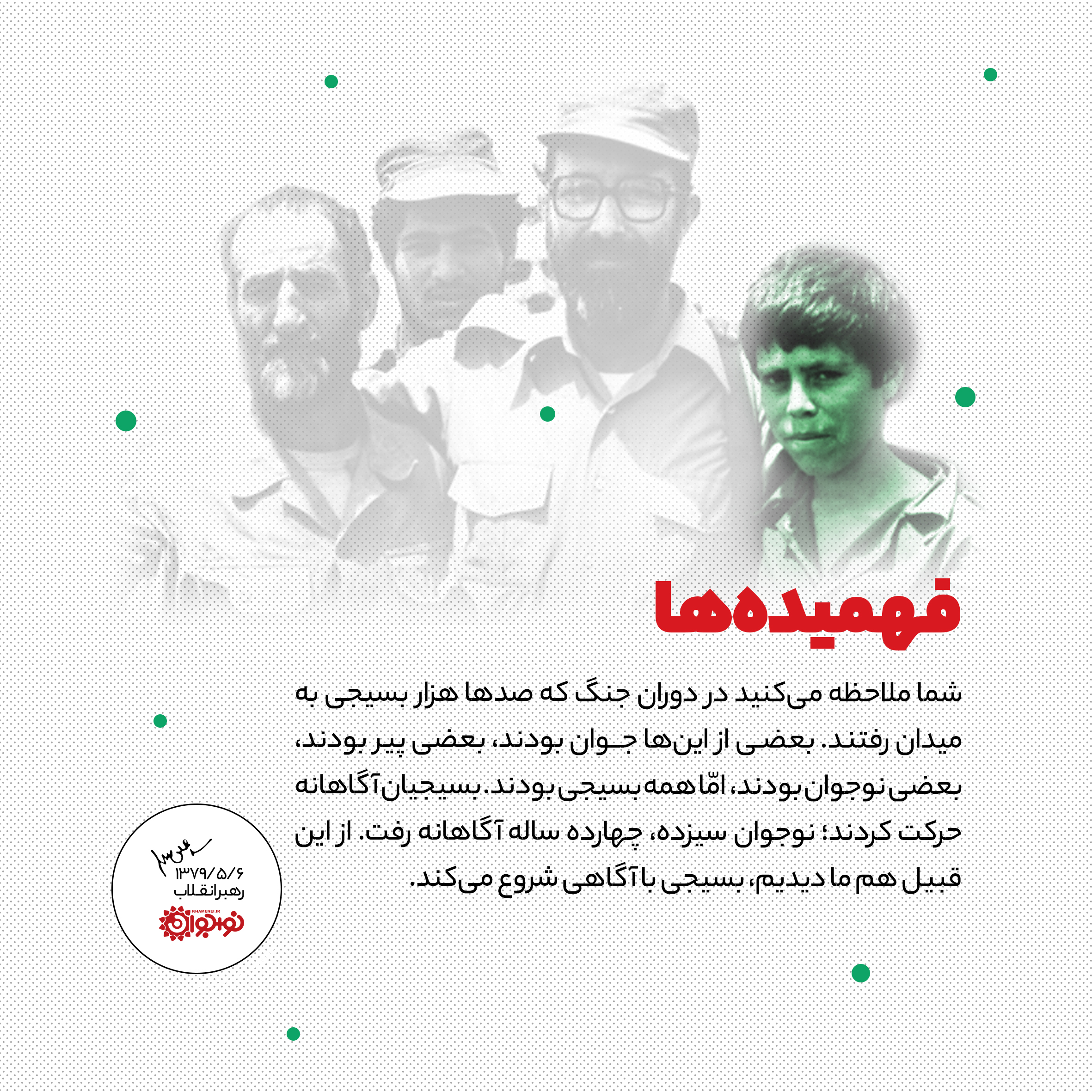 شما ملاحظه میکنید در دوران جنگ که صدها هزار بسیجی به میدان رفتند. بعضی از اینها جوان بودند، بعضی پیر بودند، بعضی نوجوان بودند، اما همه بسیجی بودند. بسیجیان آگاهانه حرکت کردند؛ نوجوان سیزده چهاردهساله آگاهانه رفت؛ از این قبیل هم ما دیدیم. بسیجی با آگاهی شروع میکند.