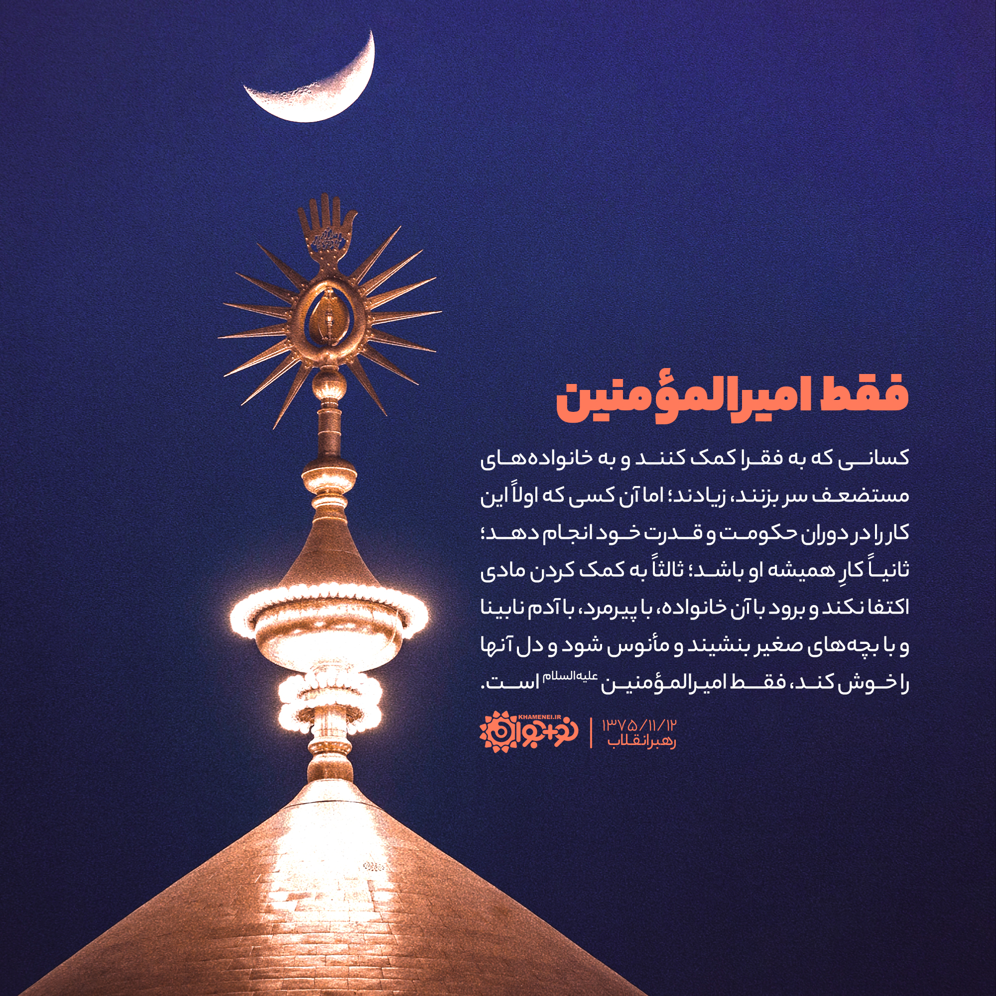 کسانی که به فقرا کمک کنند و به خانوادههای مستضعف سر بزنند، زیادند؛ اما آن کسی که اوّلاً این کار را در دوران حکومت و قدرت خود انجام دهد؛ ثانیاً کار همیشه او باشد؛ ثالثاً به کمککردن مادی اکتفا نکند و برود با این خانواده، با آن پیرمرد، با این آدم کور و نابینا، با آن بچههای صغیر بنشیند، مأنوس شود، دل آنها را خوش کند و البته کمک هم بکند و بلند شود، فقط امیرالمؤمنین علیهالسلام است.