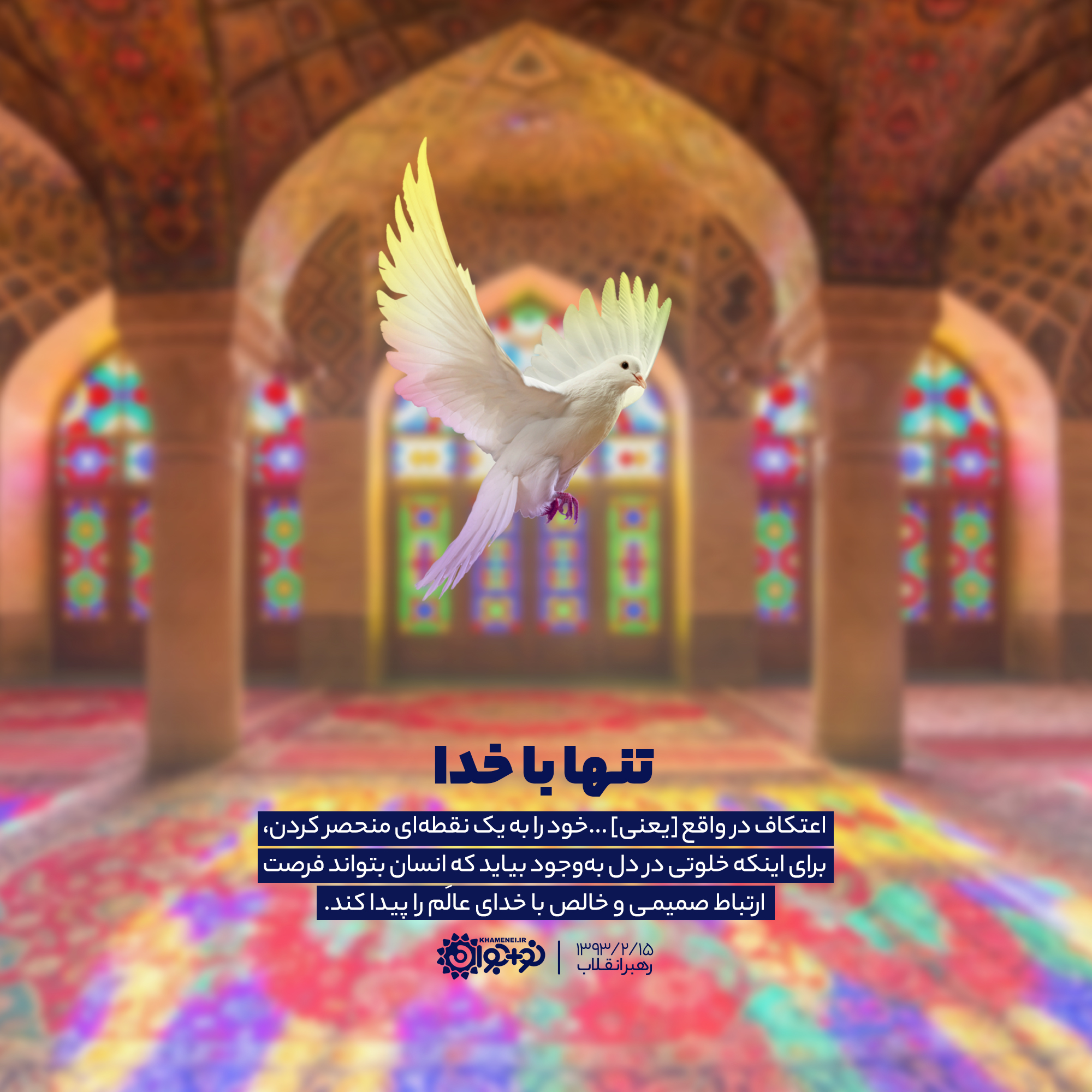 اعتکاف در واقع [یعنی] ... خود را به یک نقطهای منحصر کردن، برای اینکه خلوتی در دل بهوجود بیاید که انسان بتواند فرصت ارتباط صمیمی و خالص با خدای عالَم را پیدا کند.