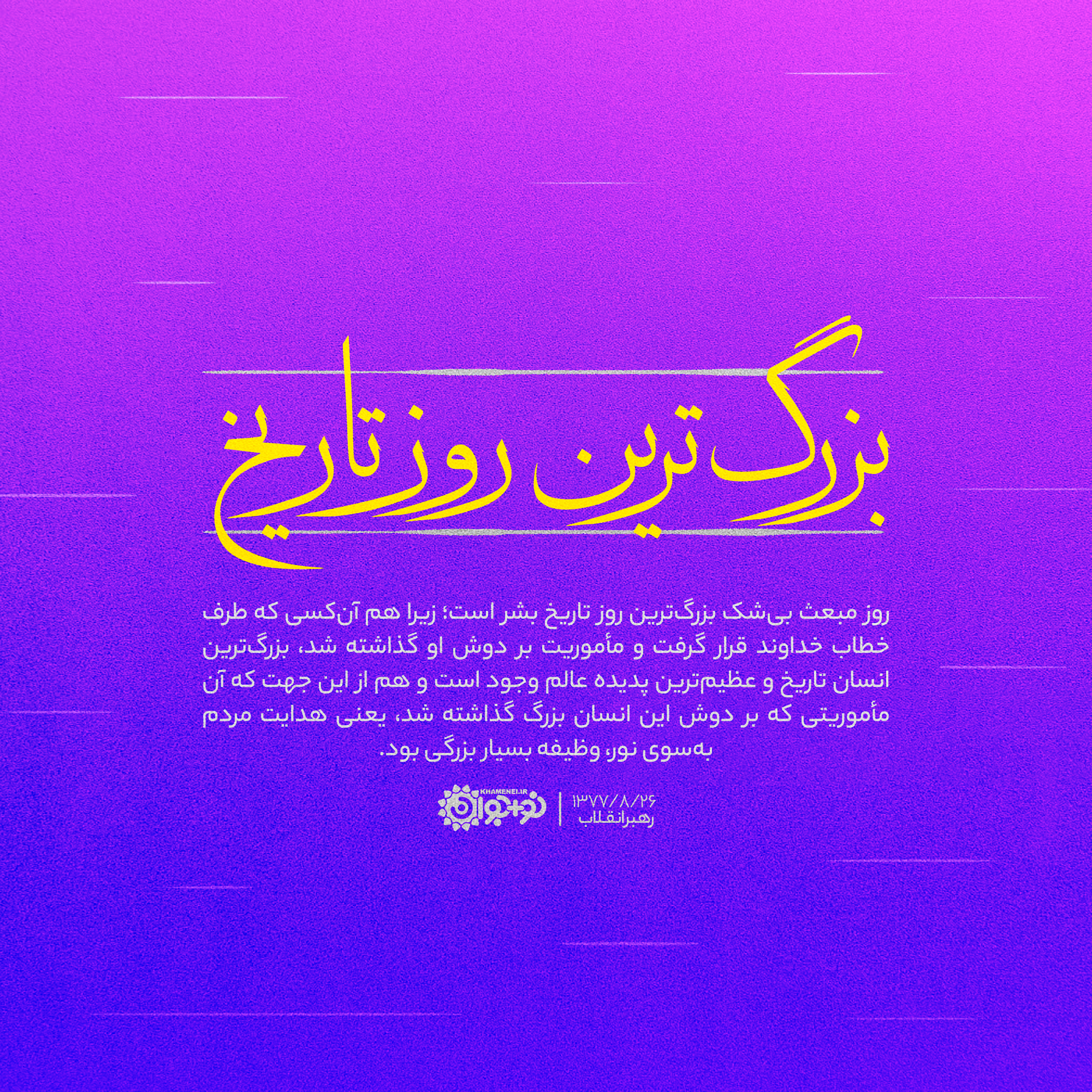 روز مبعث، بیشک بزرگترین روز تاریخ بشر است؛ زیرا هم آن کسی که طرف خطاب خداوند قرار گرفت و مأموریت بر دوش او گذاشته شد، بزرگترین انسان تاریخ و عظیمترین پدیده عالم وجود است و هم از این جهت که آن مأموریتی که بر دوش این انسانِ بزرگ گذاشته شد، یعنی هدایت مردم بهسوی نور، وظیفه بسیار بزرگی بود.