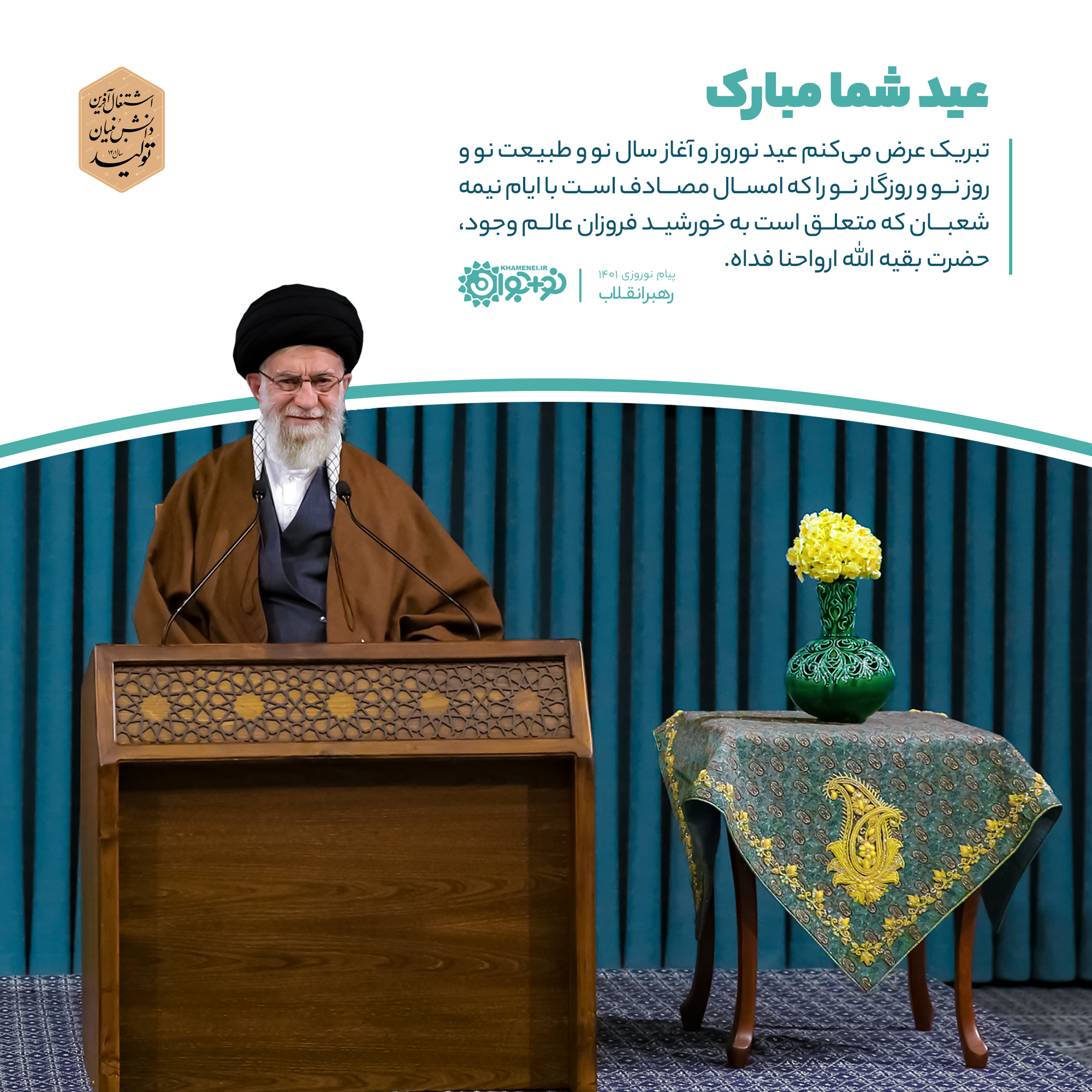 تبریک عرض میکنم عید نوروز و آغاز سال نو و طبیعت نو و روز نو و روزگار نو را که امسال مصادف است با ایام نیمه شعبان که متعلّق است به خورشید فروزان عالم وجود، حضرت بقیةالله ارواحنا فداه.