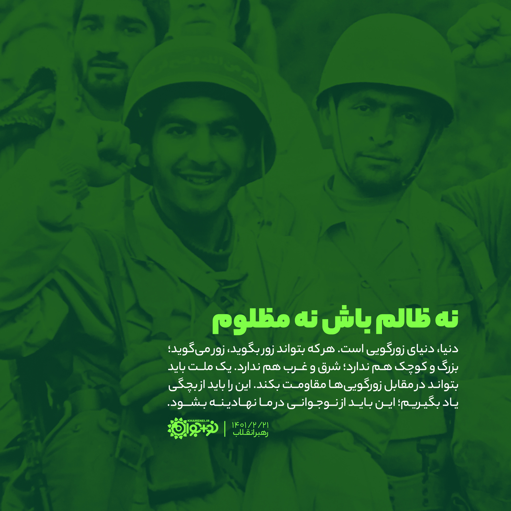 دنیا، دنیای زورگویی است. هر که بتواند زور بگوید زور میگوید؛ بزرگ و کوچک هم ندارد؛ شرق و غرب هم ندارد. باید یک ملت بتواند در مقابل زورگوییها مقاومت بکند. این را باید از بچگی یاد بگیریم؛ این از نوجوانی باید در ما نهادینه بشود.