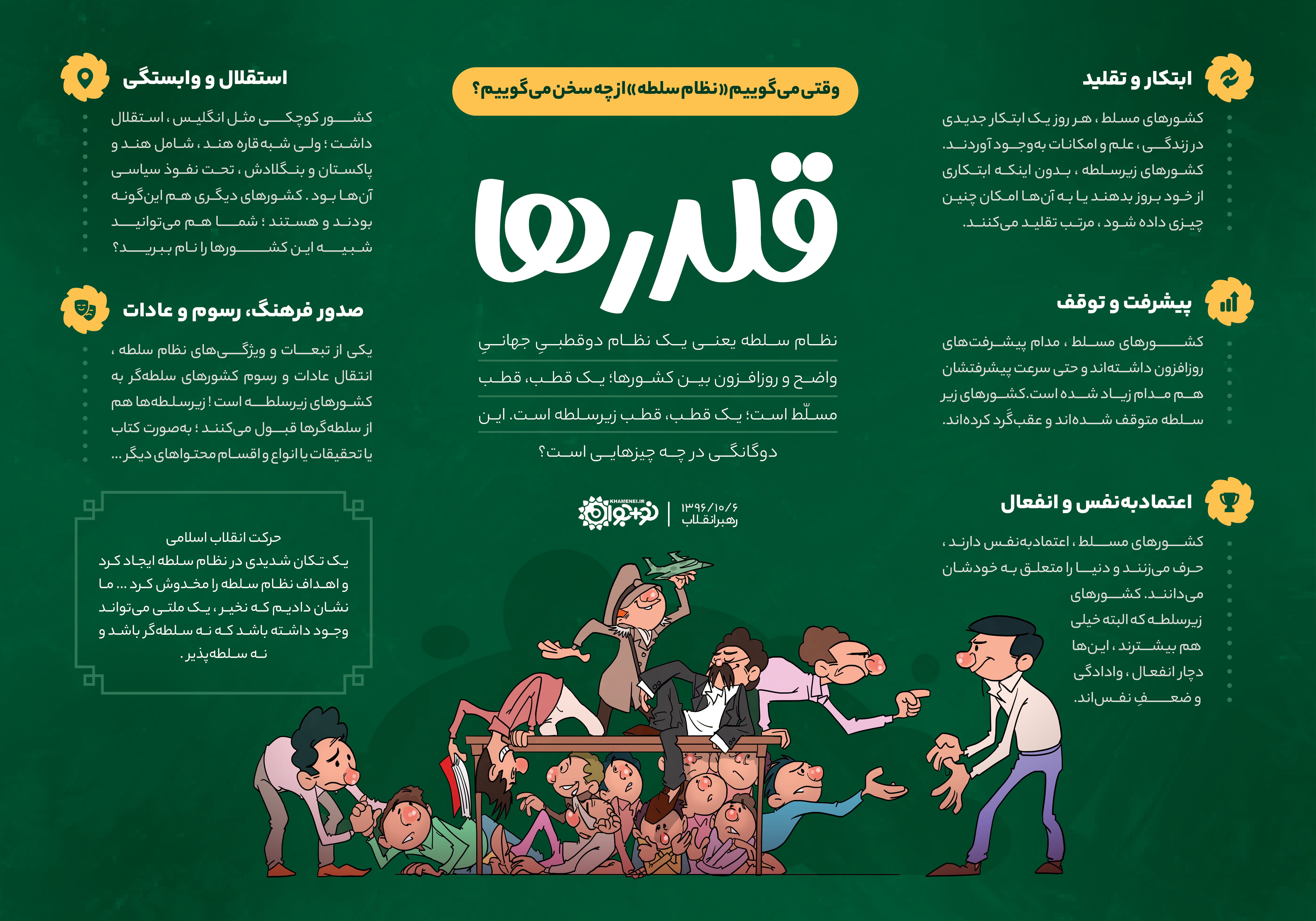 نظام سلطه، یعنی یک نظام دوقطبیِ جهانیِ واضح و روزافزون بین کشورها؛ یک قطب، قطب مسلط است؛ یک قطب، قطب زیرسلطه است. این دوگانگی در چه چیزهایی است؟