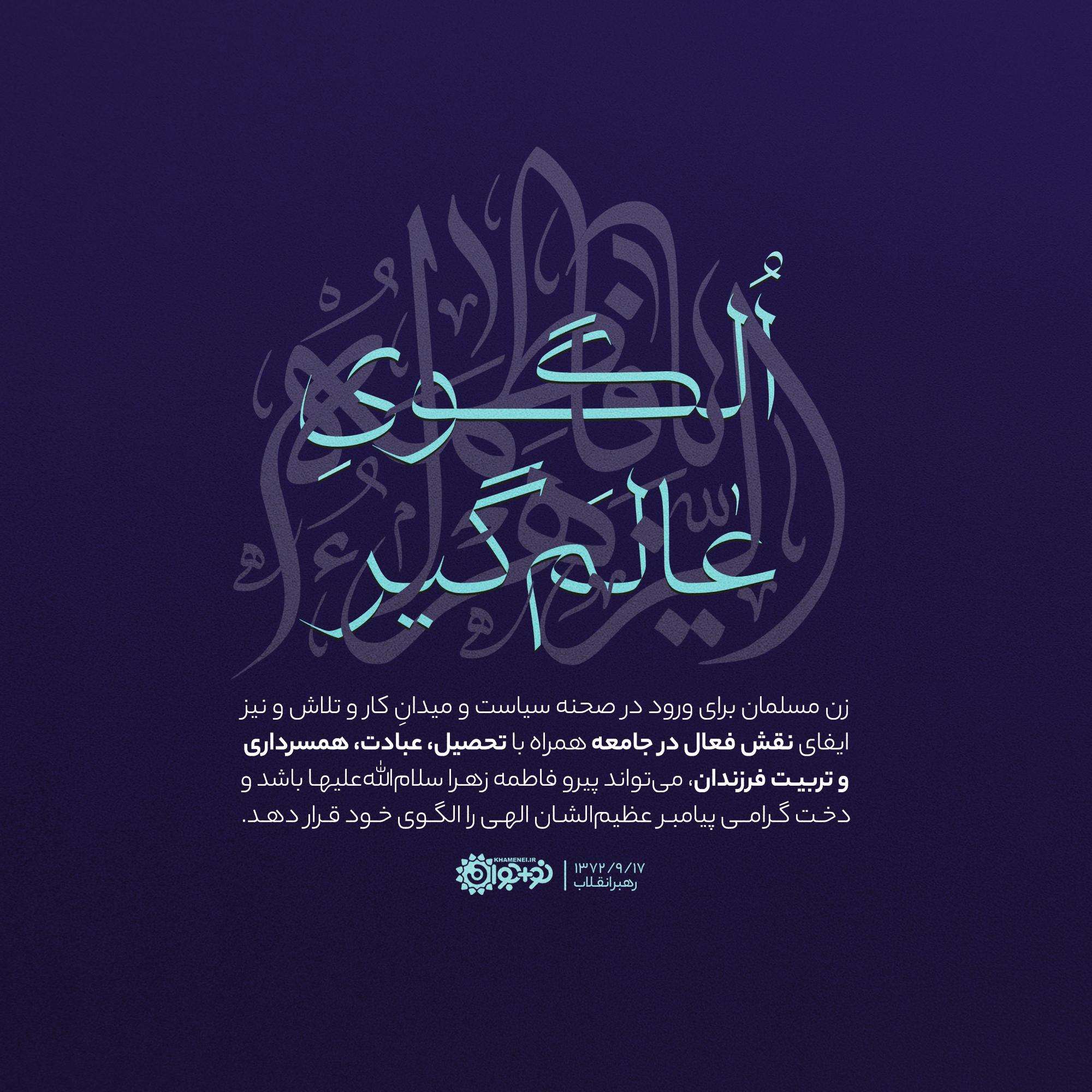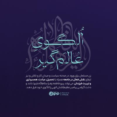 زن مسلمان برای ورود در صحنه سیاست و میدان کار و تلاش و نیز ایفای نقش فعال در جامعه همراه با تحصیل، عبادت، همسرداری و تربیت فرزندان میتواند پیرو فاطمه زهرا (س) باشد و دخت گرامی پیامبر عظیمالشأن الهی را الگوی خود قرار دهد.