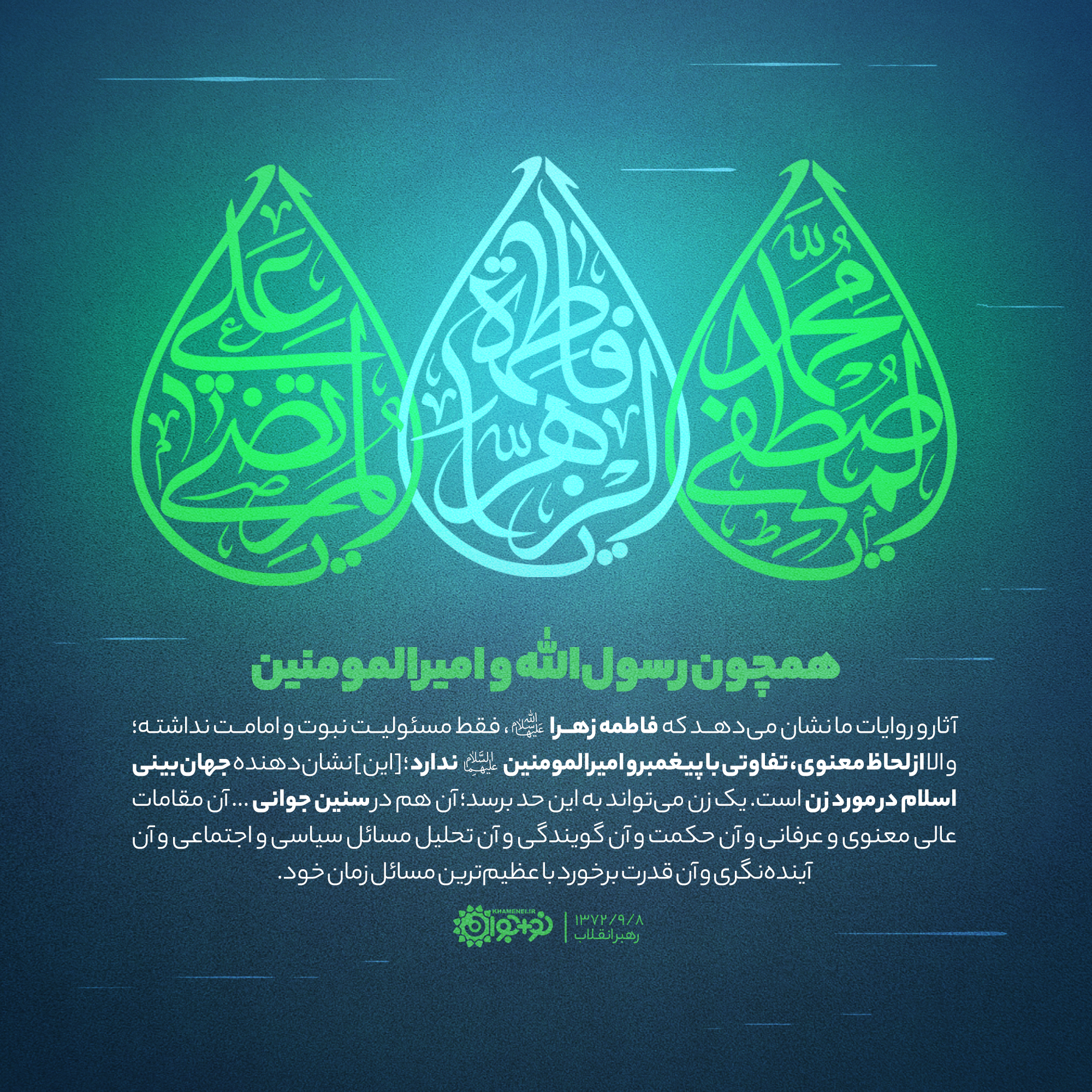 آثار و روایات ما نشان میدهد که فاطمه زهرا سلاماللهعلیها، فقط مسئولیت نبوت و امامت نداشته، و اِلا از لحاظ معنوی، تفاوتی با پیغمبر و امیرالمؤمنین علیهماالصّلاةوالسّلام ندارد؛ [این] نشاندهنده جهانبینی اسلام در مورد زن است. یک زن میتواند به این حد برسد؛ آن هم در سنین جوانی ... آن مقامات عالی معنوی و عرفانی و آن حکمت و آن گویندگی و آن تحلیل مسائل سیاسی و اجتماعی و آن آیندهنگری و آن قدرت برخورد با عظیمترین مسائل زمان خود.