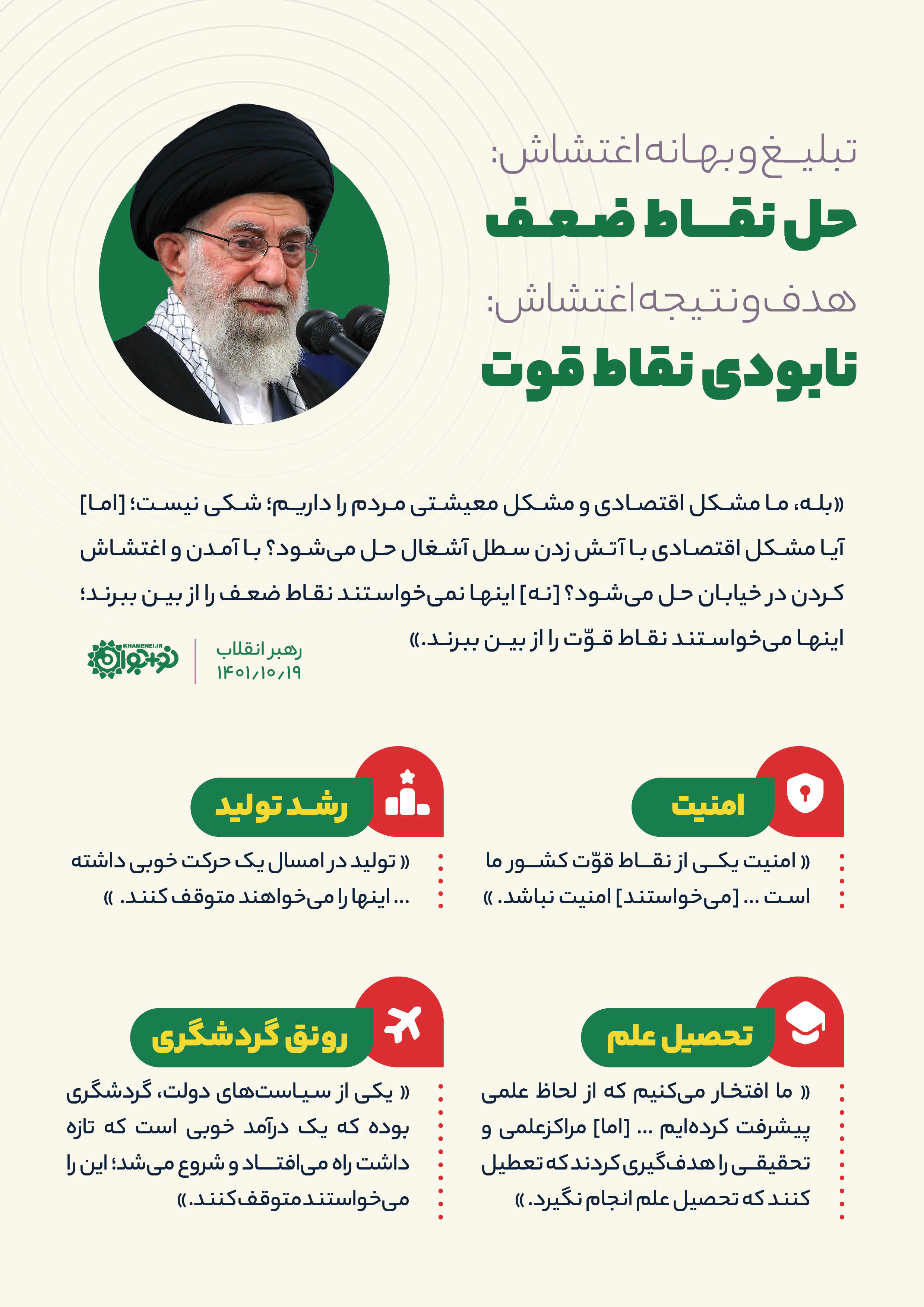بله، ما مشکل اقتصادی و مشکل معیشتی مردم را داریم؛ شکّی نیست؛ [اما] آیا مشکل اقتصادی با آتش زدن سطل آشغال حل میشود؟ با آمدن و اغتشاش کردن در خیابان حل میشود؟ [نه] اینها نمیخواستند نقاط ضعف را از بین ببرند؛ اینها میخواستند نقاط قوّت را از بین ببرند.