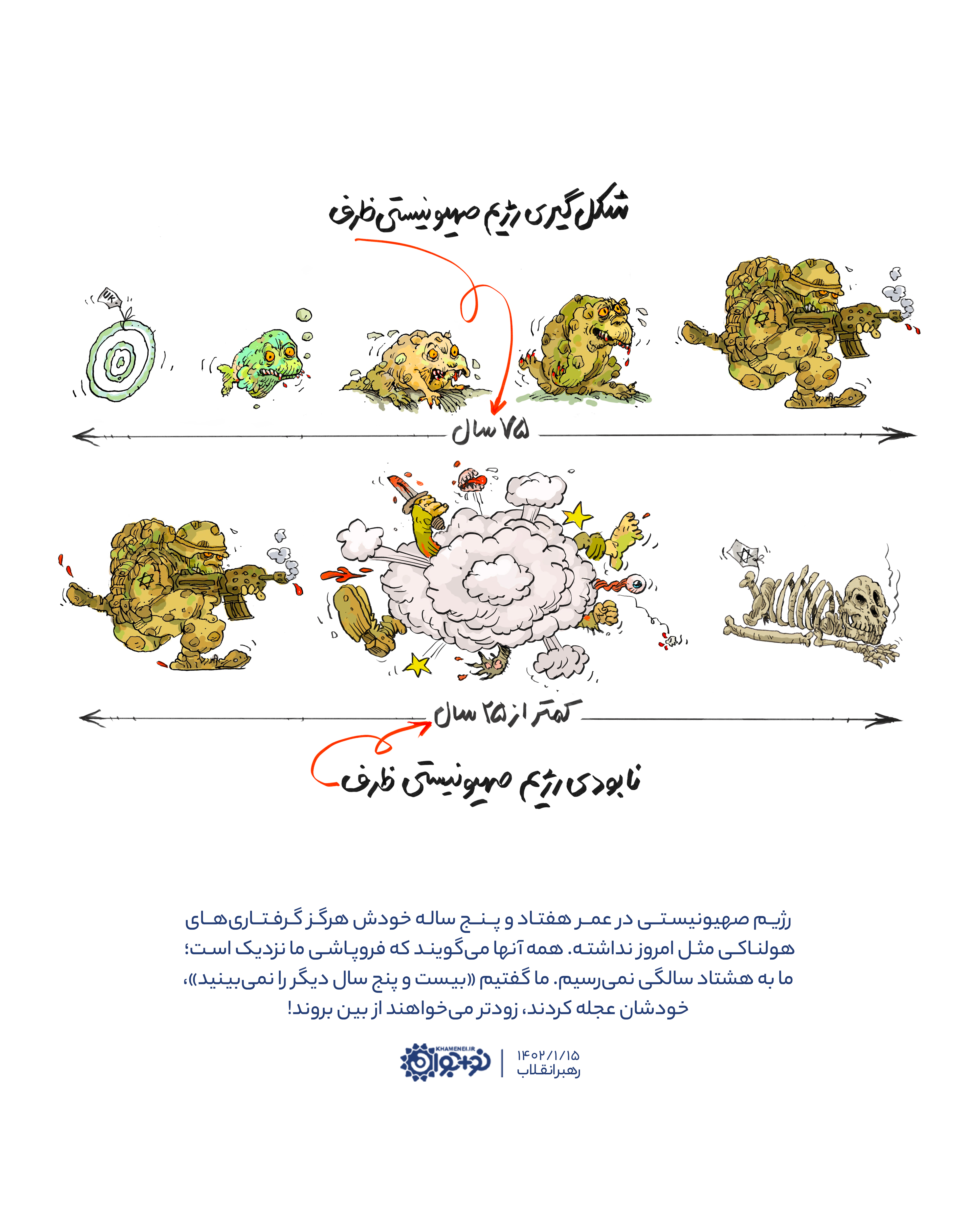 رژیم صهیونیستی در عمر هفتادوپنجساله خودش هرگز گرفتاریهای هولناکی مثل امروز نداشته. همه آنها میگویند که فروپاشی ما نزدیک است؛ ما به هشتاد سالگی نمیرسیم. ما گفتیم «بیستوپنجسال دیگر را نمیبینید»، خودشان عجله کردند، زودتر میخواهند از بین بروند!