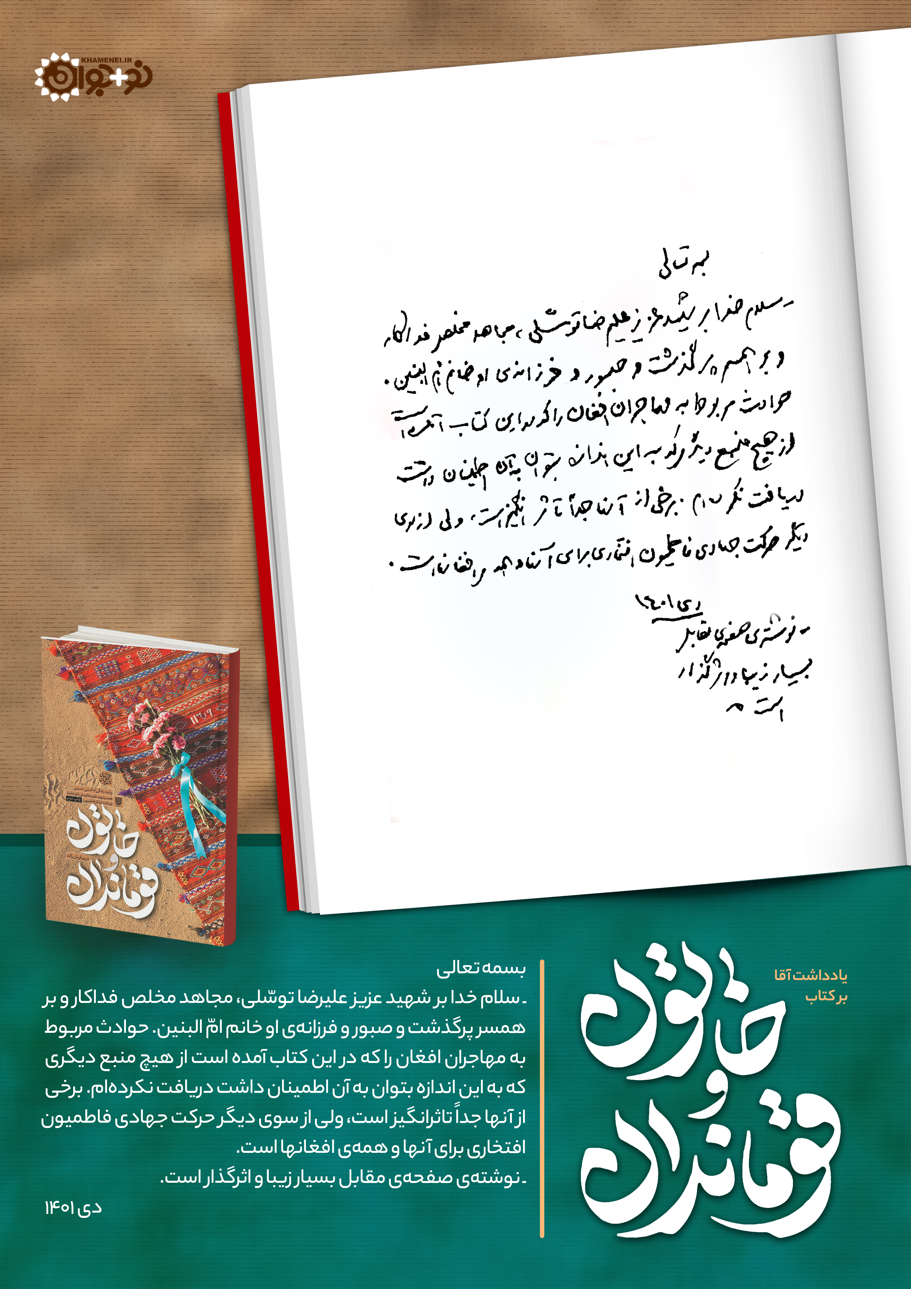 در مراسم چهاردهمین پاسداشت ادبیات جهاد و مقاومت در مشهد مقدس، یادداشت آقا بر کتاب «خاتون و قوماندان»، روایت زندگی همسر شهید علیرضا توسلی فرمانده لشکر فاطمیون، منتشر شد: