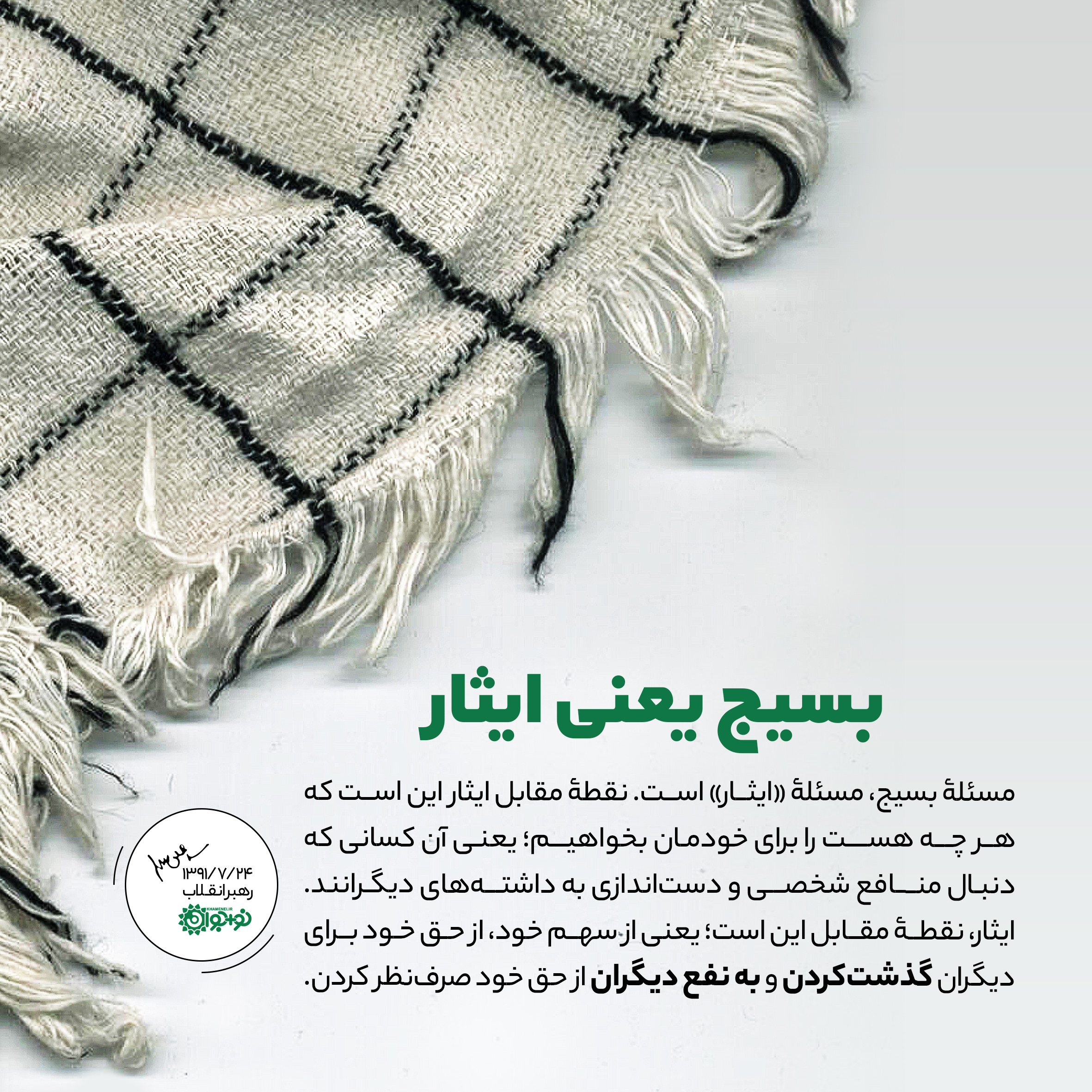 مسئله بسیج، مسئله «ایثار» است. نقطه مقابل ایثار این است که هرچه هست را برای خودمان بخواهیم؛ یعنی آن کسانی که دنبال منافع شخصی و دستاندازی به داشتههای دیگراناند. ایثار، نقطه مقابل این است؛ یعنی از سهم خود، از حق خود برای دیگران گذشتکردن و به نفع دیگران از حق خود صرفنظرکردن.