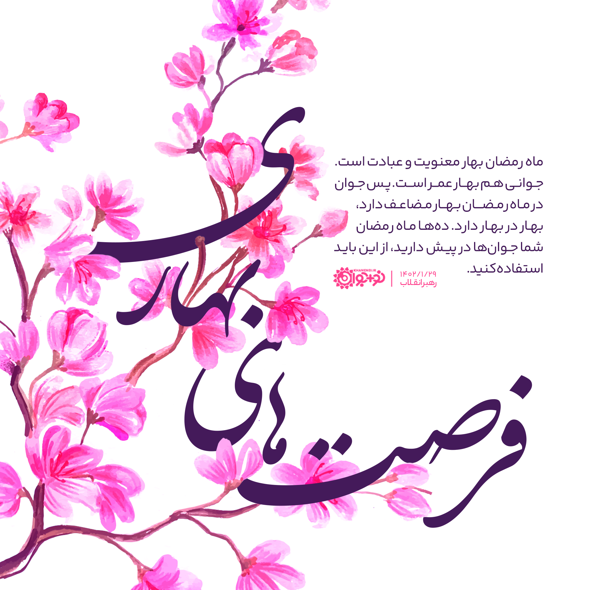 ماه رمضان بهار معنویت و عبادت است. جوانی هم بهار عمر است. پس جوان در ماه رمضان بهار مضاعف دارد، بهار در بهار دارد. دهها ماه رمضان شما جوانها در پیش دارید، از این باید استفاده کنید.